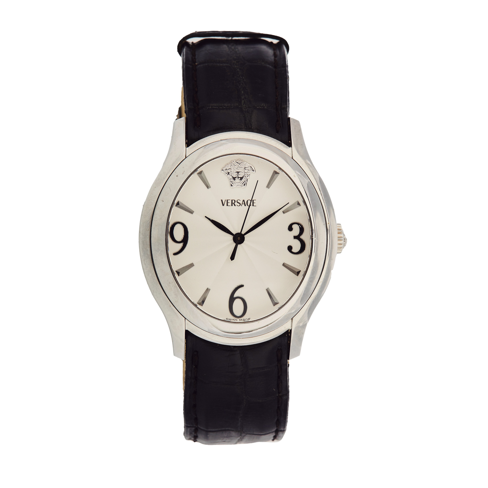 VERSACE «Bond Street». Reloj de pulsera unisex. En acero y correa de piel. Esfera satinada con numeración arábiga y a trazos aplicados. Mecanismo de quartz.