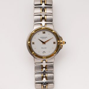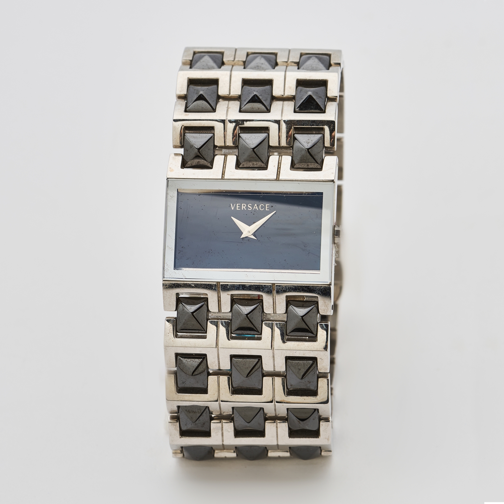 VERSACE. Reloj de pulsera para señora. En acero y onix, Esfera negra sin numeración.