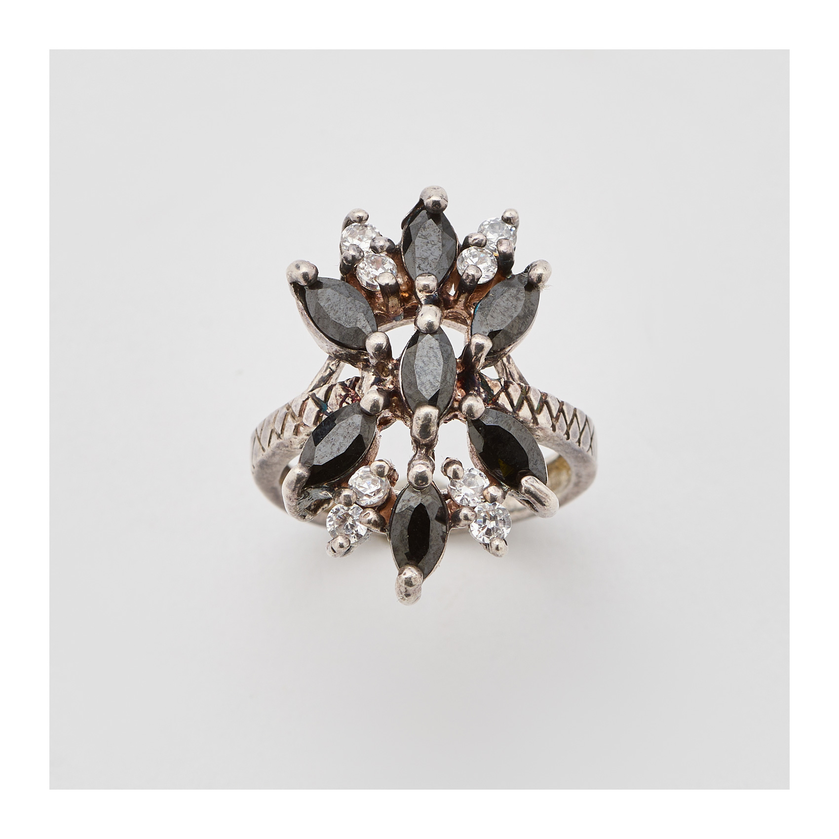 Sortija tipo lanzadera en plata con ónix talla marquise y circonitas talla redonda.