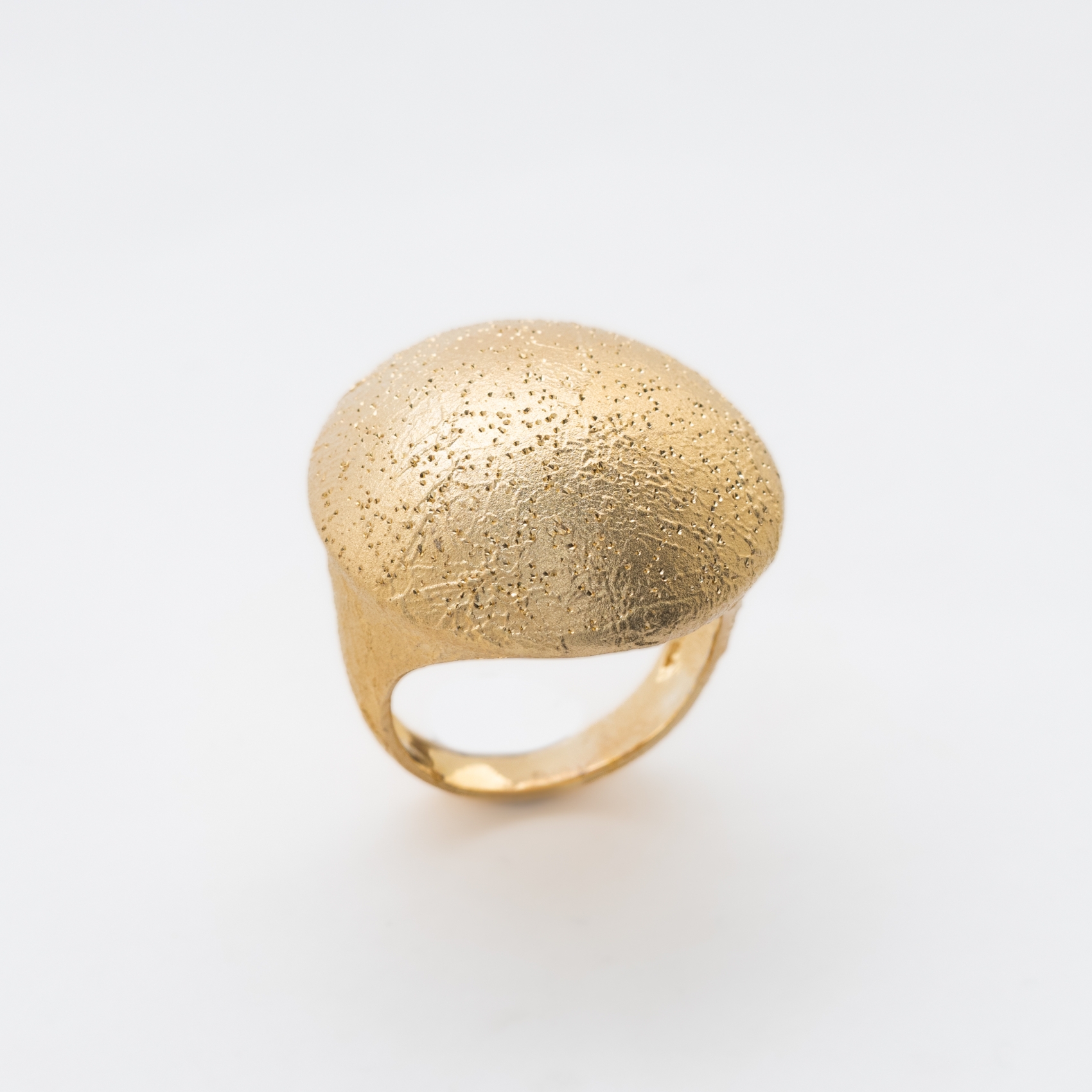 Sortija diseño circular en plata dorada con acabado diamantado.