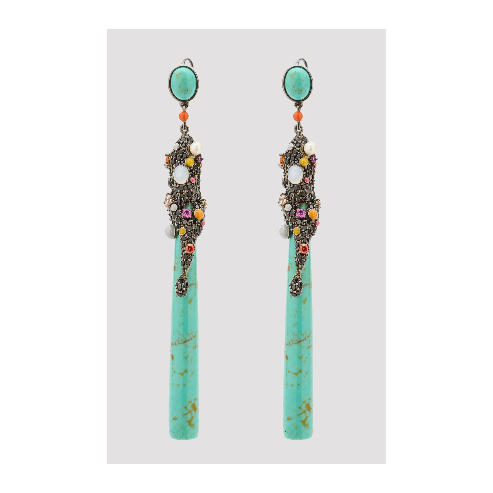 Pendientes largos en plata pavonada con símiles de amazonita tallas cabujón y cilíndrica, circonitas multicolor, cabujones de piedra luna y perla cultivada de 3 mm.