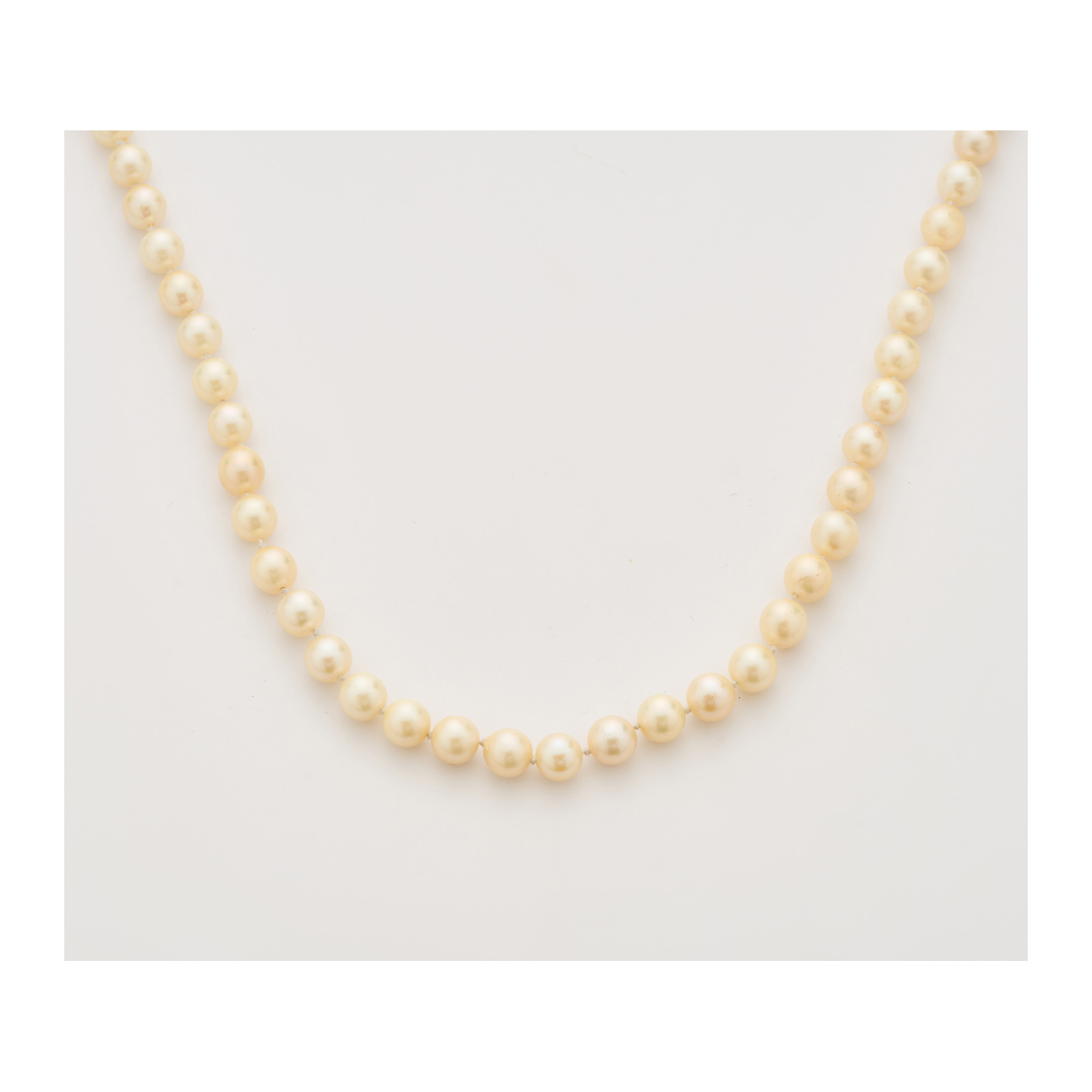 Collar de un hilo de perlas cultivadas de 7-8 mm. con cierre diseño flor en oro matizado perla central y esmalte verde.