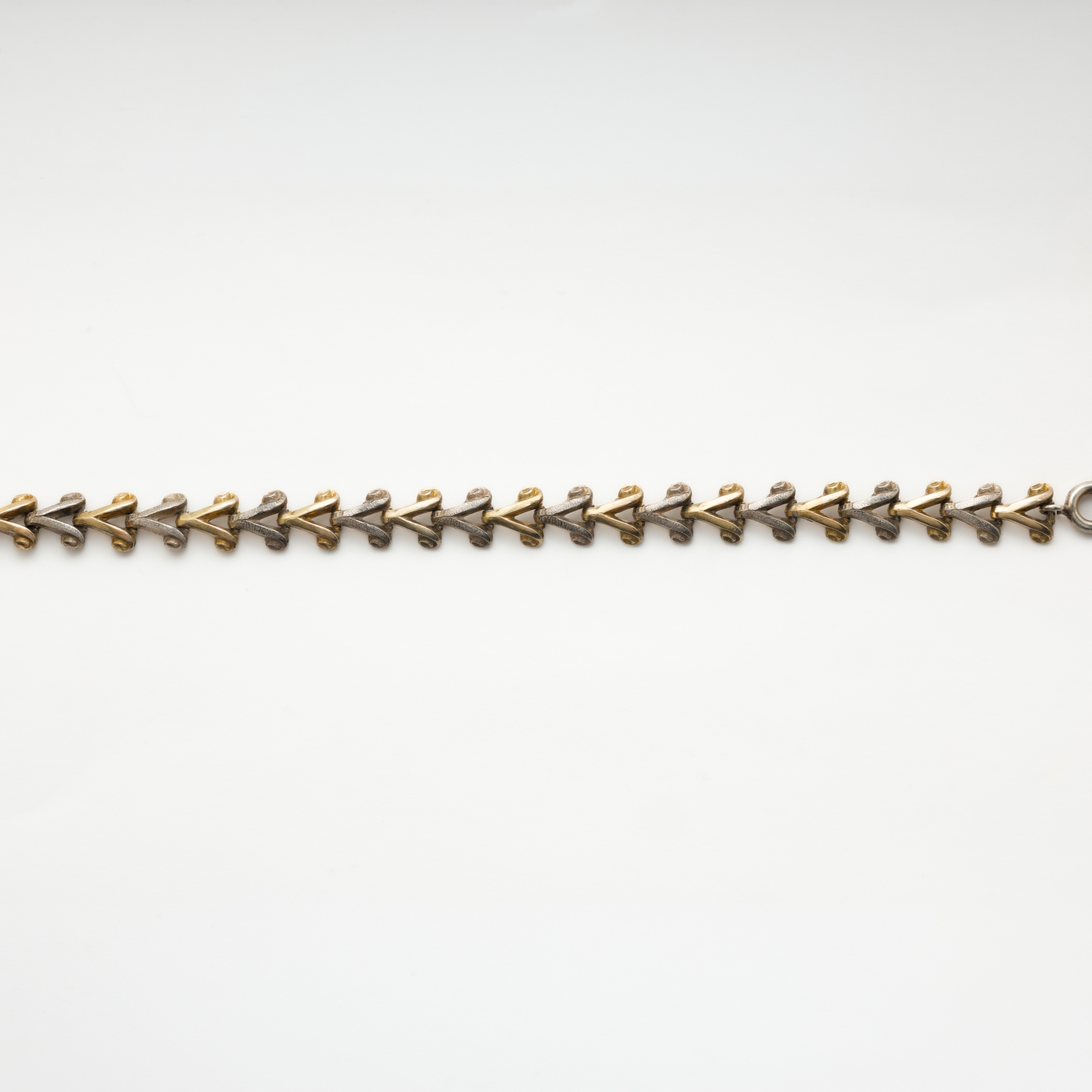 Pulsera en plata con eslabones articulados diseño V y roleos.