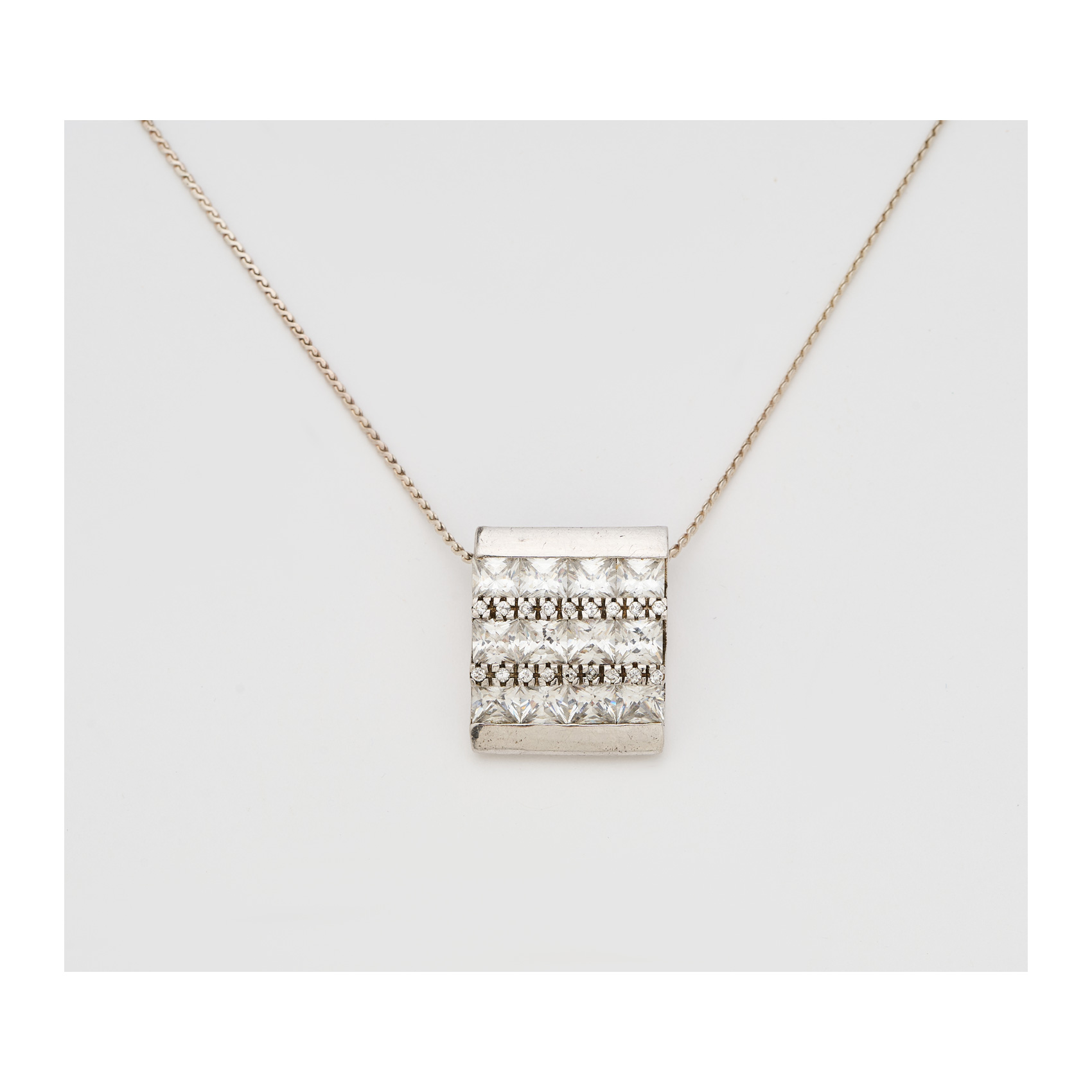Colgante diseño rectangular en plata con bandas alternadas de circonitas talla carré engastadas en carril y talla redonda engastadas en garras, 2,3 x 2 cm.