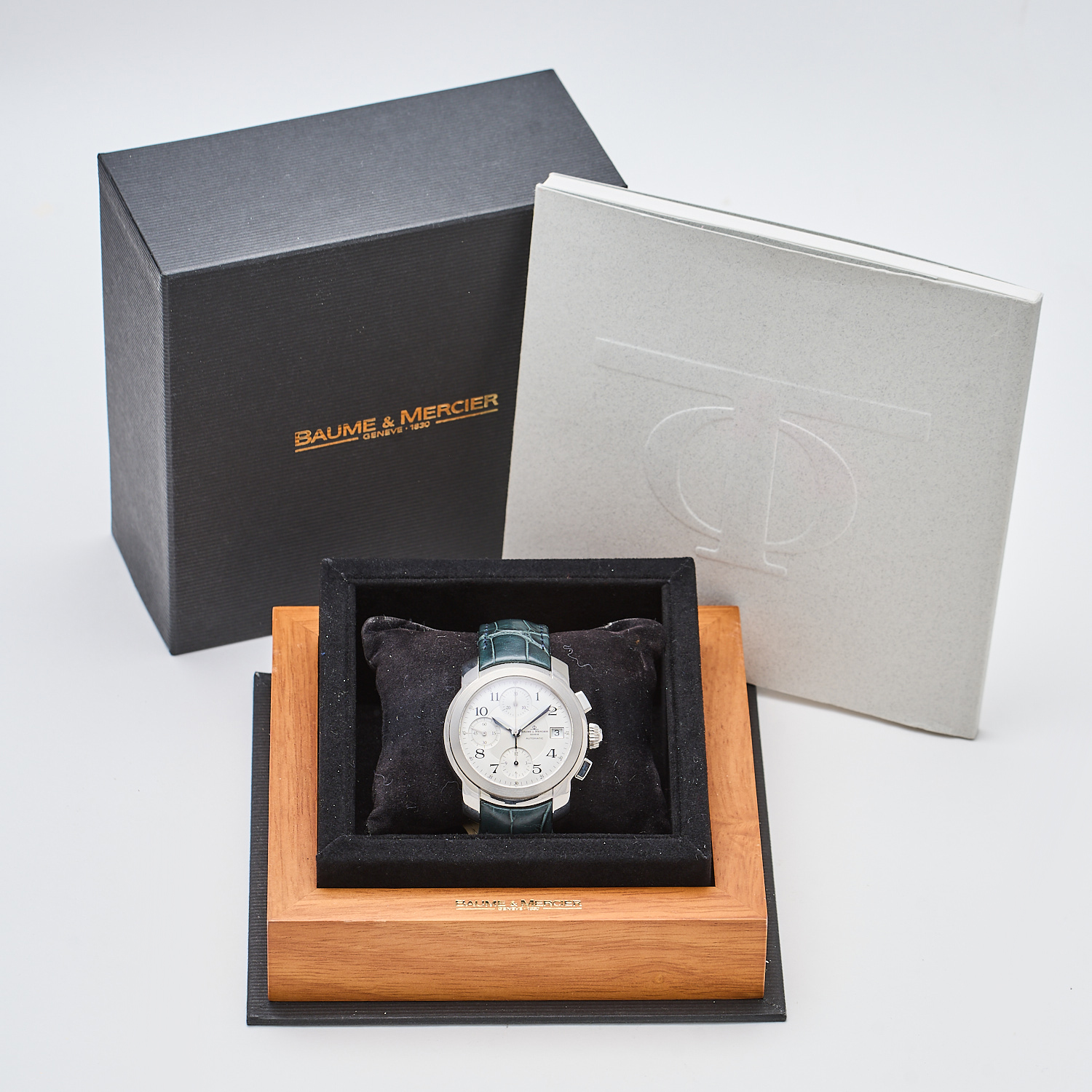 BAUME & MERCIER «Capeland» Cronograph. Reloj de pulsera para caballero. En acero y correa de piel con cierre desplegable. Ref/Nº 5217839. Esfera satinada con numeración arábiga. Calendario fecha a las 3 y segundero a las 9.