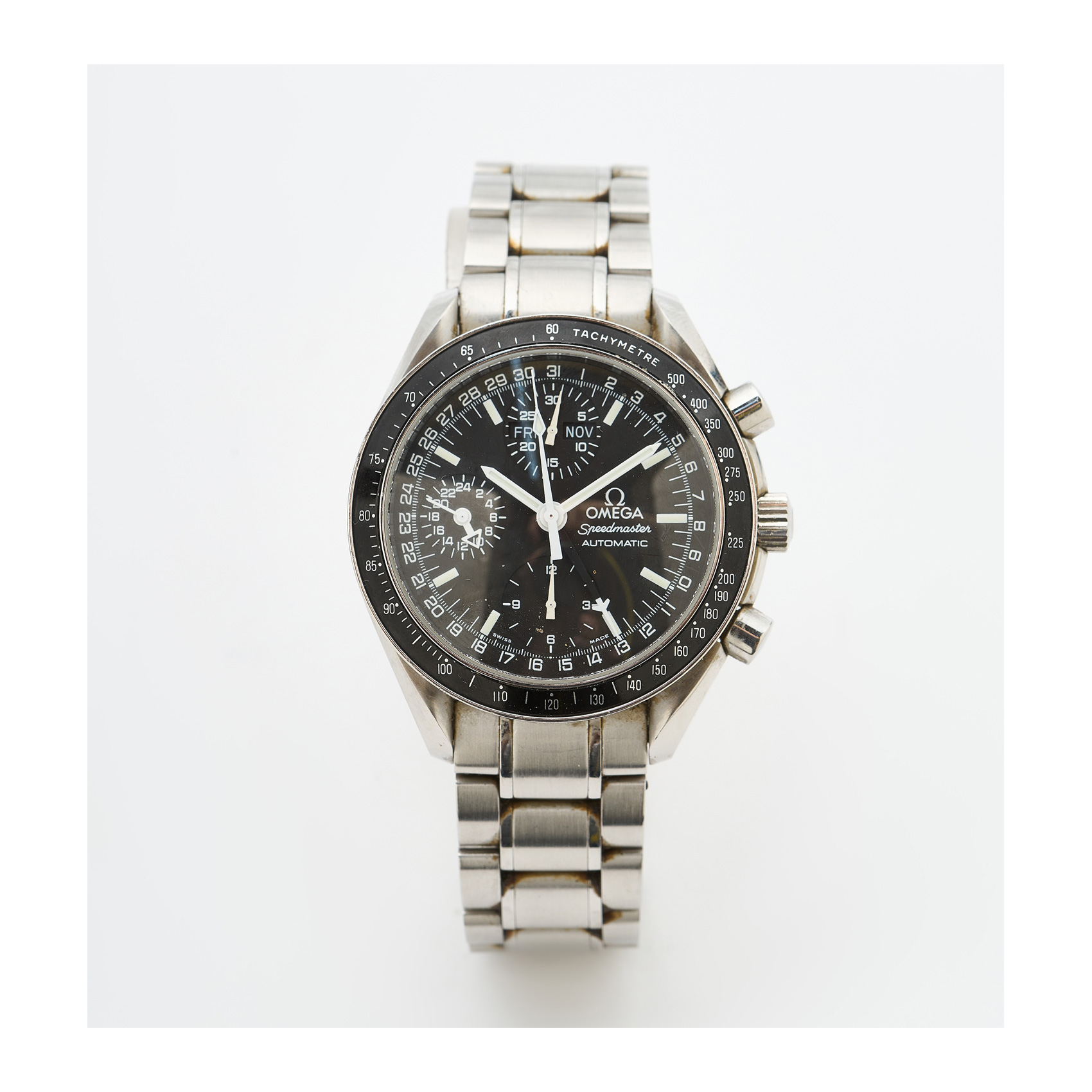 OMEGA SPEEDMASTER. Reloj de pulsera para caballero. En acero. Ref/Nº 35205000-59406649. Esfera negra con numeración a trazos aplicados. Calendario día y fecha a las 12. Segundero a las 9.