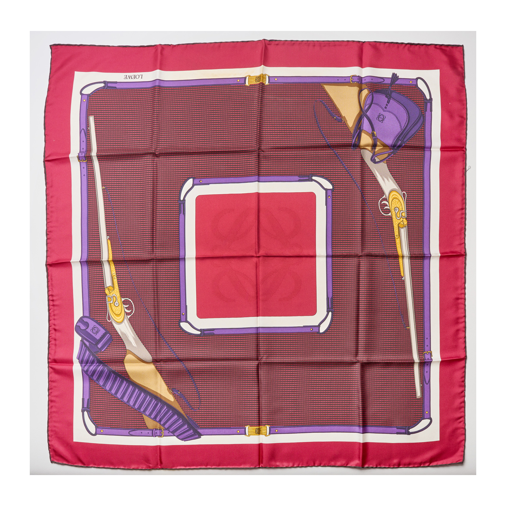 LOEWE. Pañuelo en seda de tonalidad burdeos, negro y morado con estampado de rifles y de hebillas. En muy buen estado. Presenta ligera mancha en un extremo.