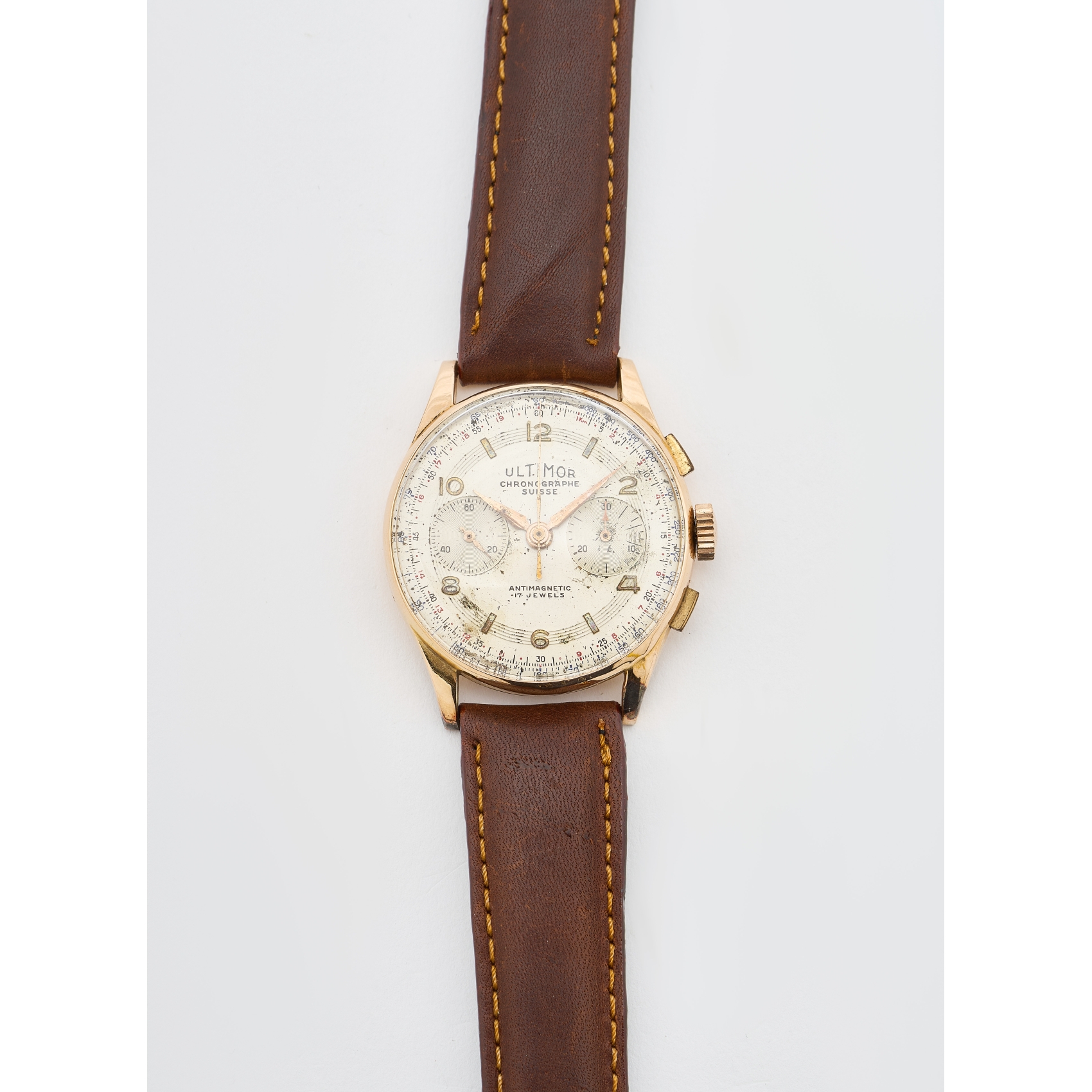 ULTIMOR. Reloj cronógrafo suizo de pulsera. En oro y correa de piel, c.1940. Esfera en tonalidad marfil con numeración arábiga y a trazos aplicados. Segundero a las 9. Mecanismo de cuerda manual.