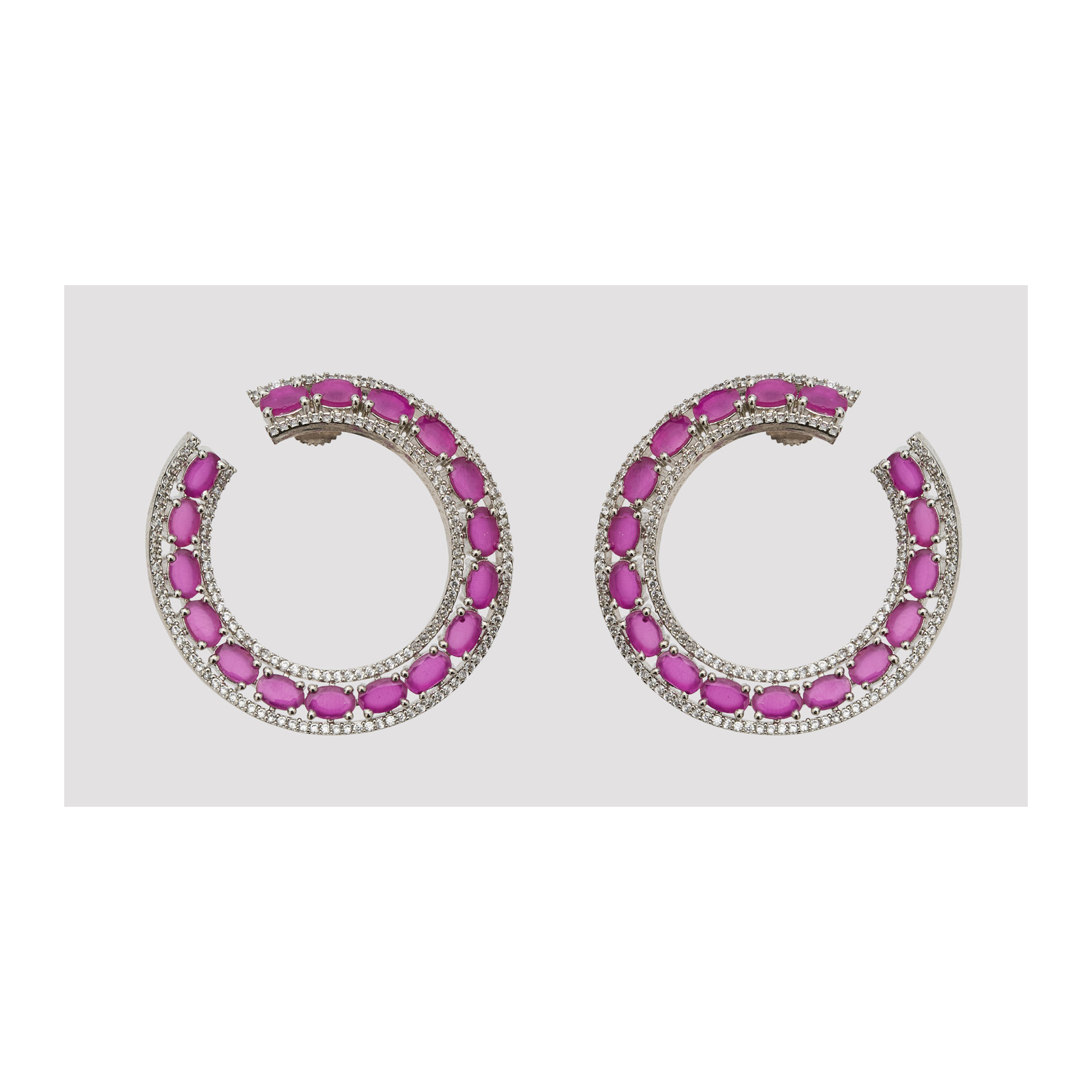 Pendientes diseño circular en plata rodiada con símiles de rubí talla oval y circonitas.