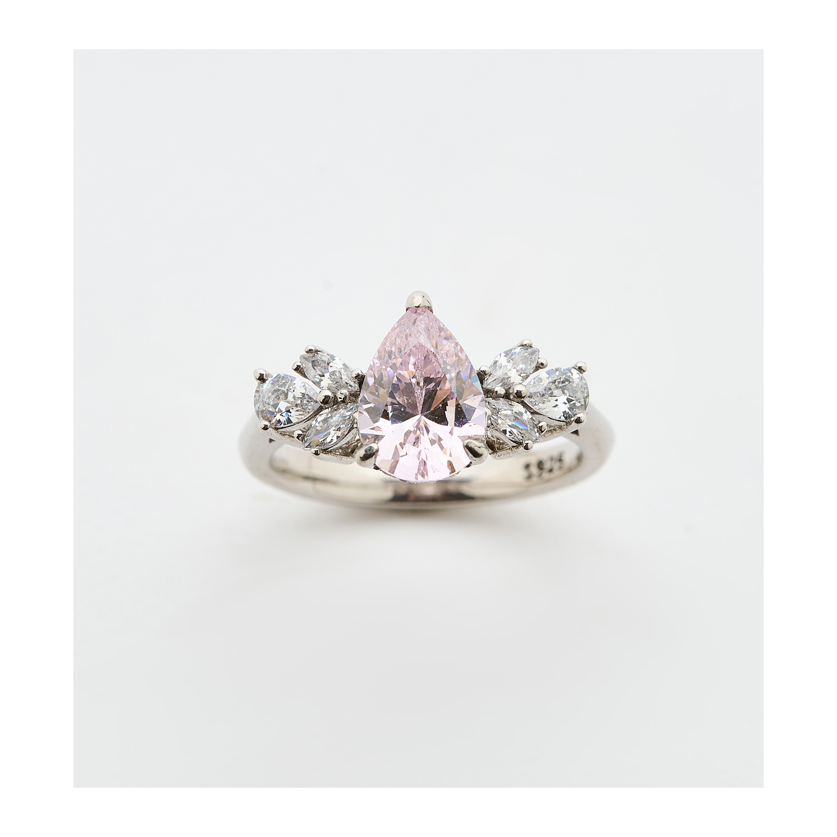 Sortija en plata con espinela rosa talla perilla y circonitas.