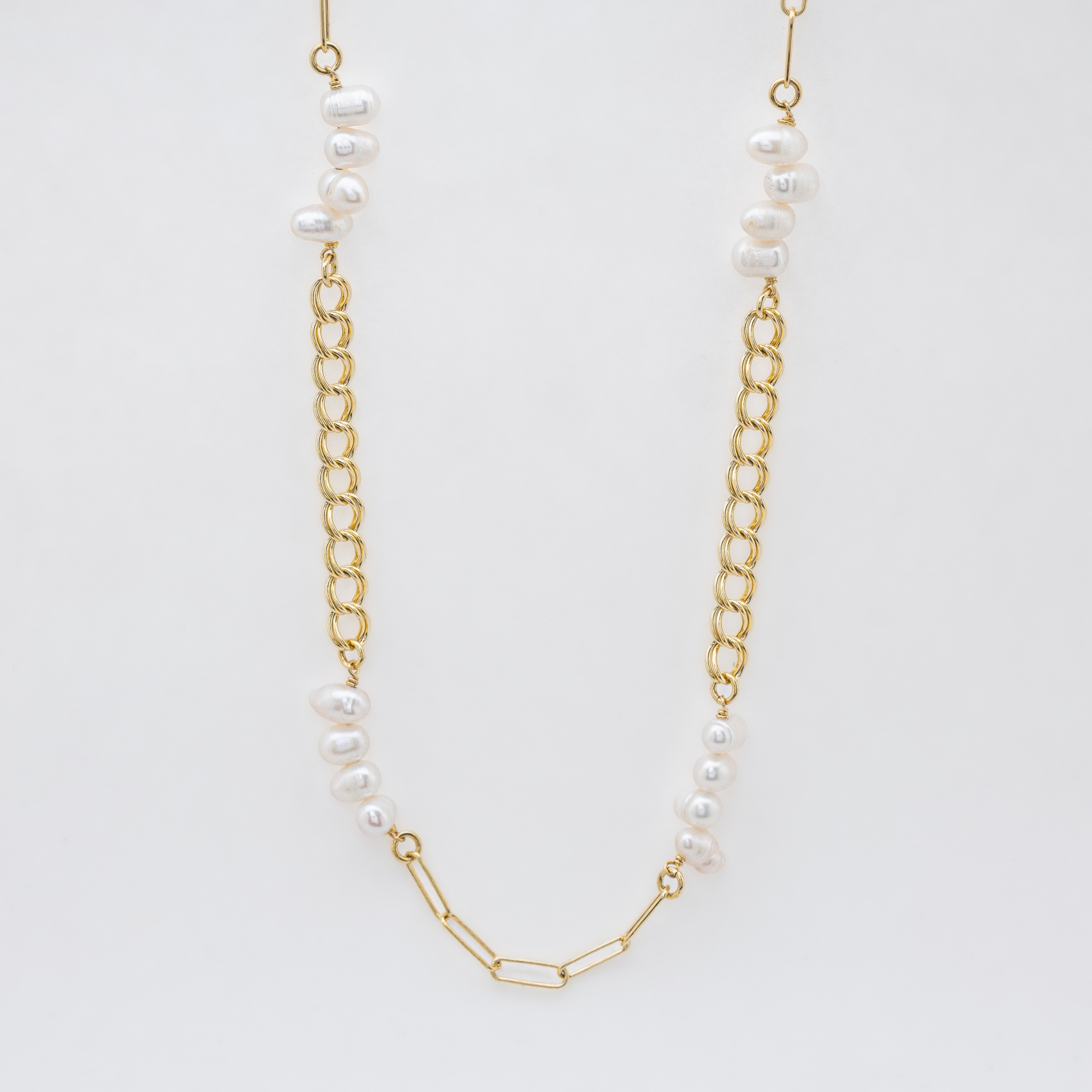 Gargantilla en plata dorada formada por varios tramos de cadena forjada, cadena milanesa y perlas de río de 7 mm.