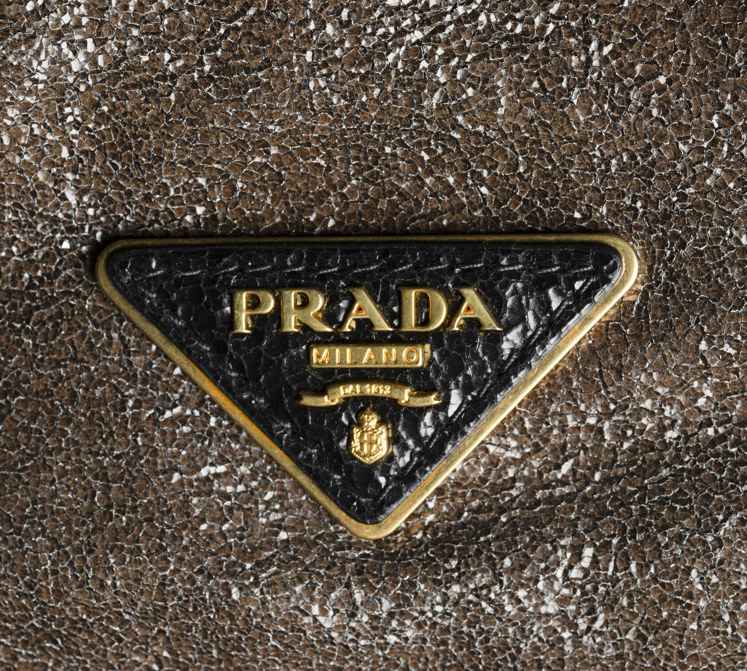 PRADA. Bolso modelo «Studded Craquele» en piel metalizada con herrajes, tachuelas y remaches en metal dorado y plateado. Cierre superior de cremallera. Bolsillo exterior con cierre de cremallera y pasador. Falta la correa larga. En perfecto estado.