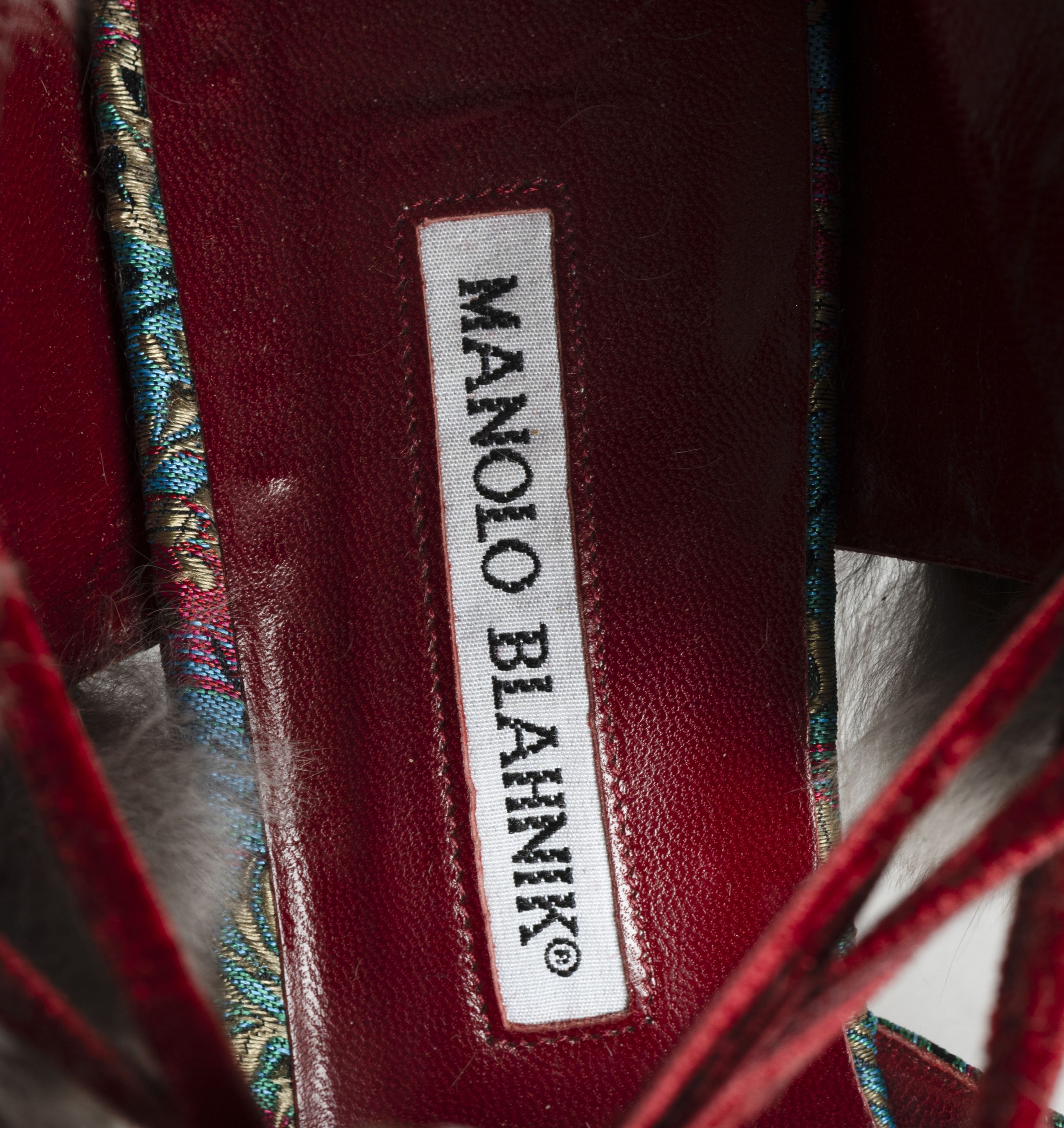 MANOLO BLAHNIK. Zapato stiletto modelo «Rosaurov» de tacón de aguja semicerrado en jacquard damasco de tonalidad rosada y azulada con cierre de lazo en terciopelo rojo y remate en pelo de visón. Suela en cuero marrón. En perfecto estado.