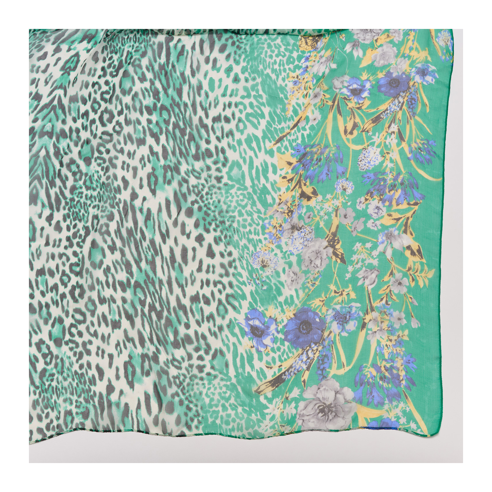 ROBERTO VERINO. Foulard en seda con estampado de leopardo en tonalidades verdes, negras y blancas y detalles florales. Adjunta gamuza y caja estuche originales.
