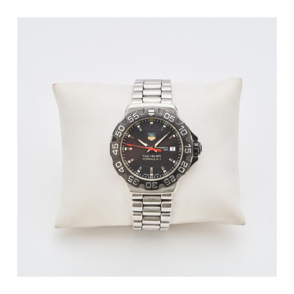 TAG HEUER «Fórmula 1». Reloj de pulsera para caballero, c.2008. En acero y bisel de carburo de titanio. Esfera negra con numeración a trazos aplicados. Calendario fecha a las 3. Mecanismo de quartz. Cierre desplegable.
