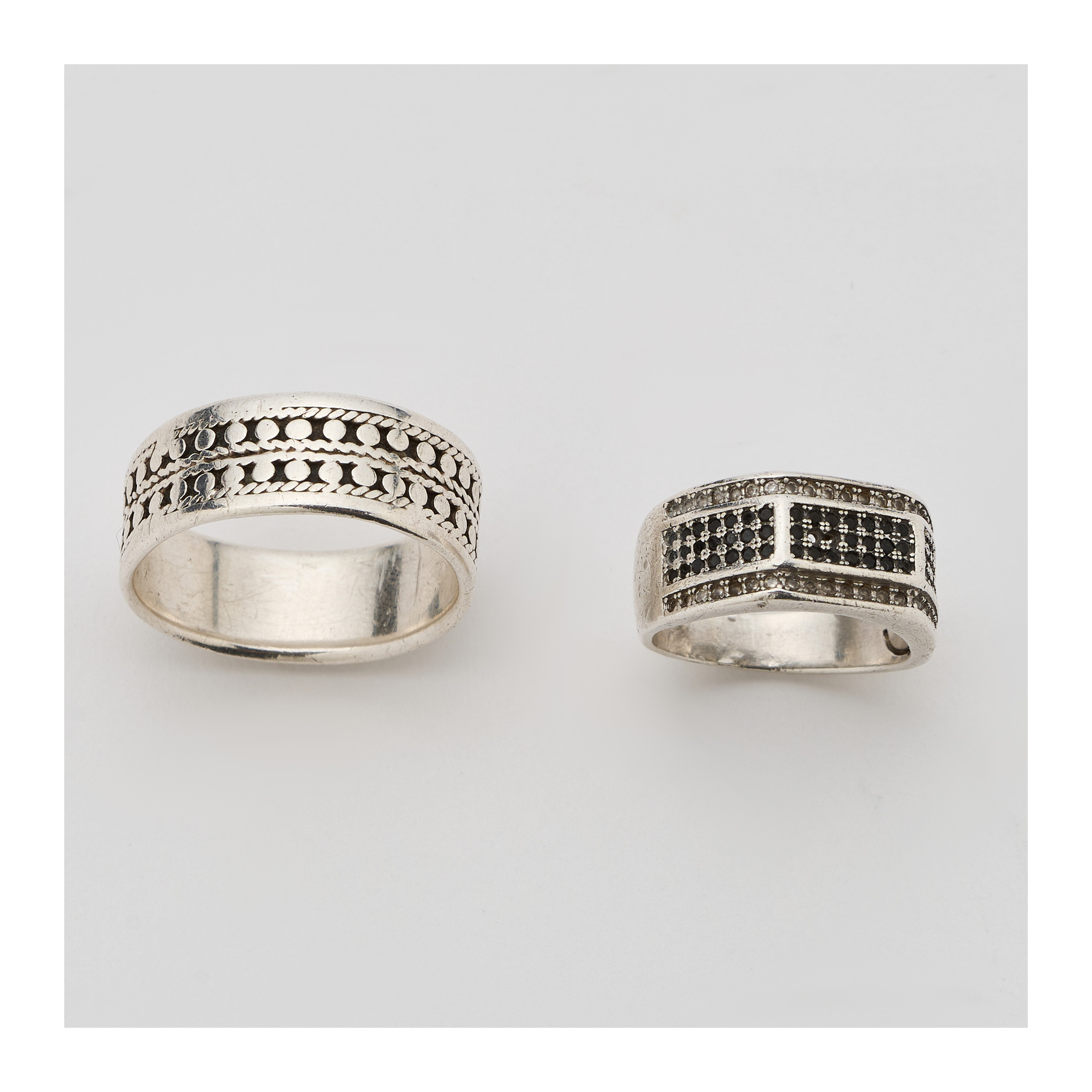 Dos sortijas en plata, una alianza labrada y otra con circonitas blancas y negras.