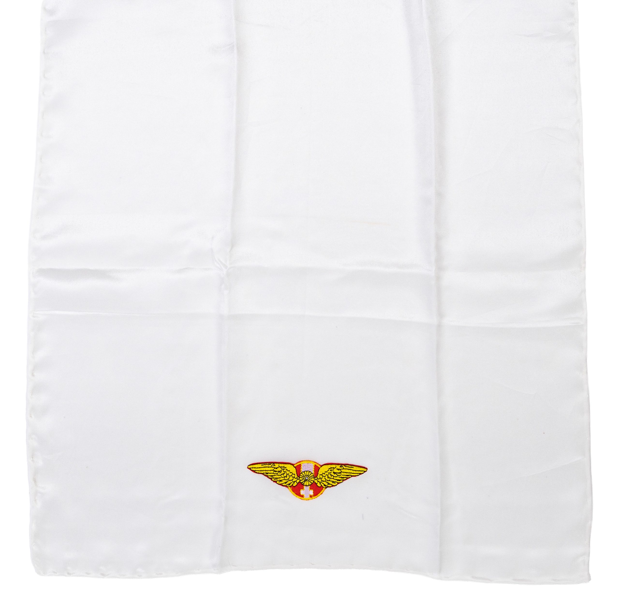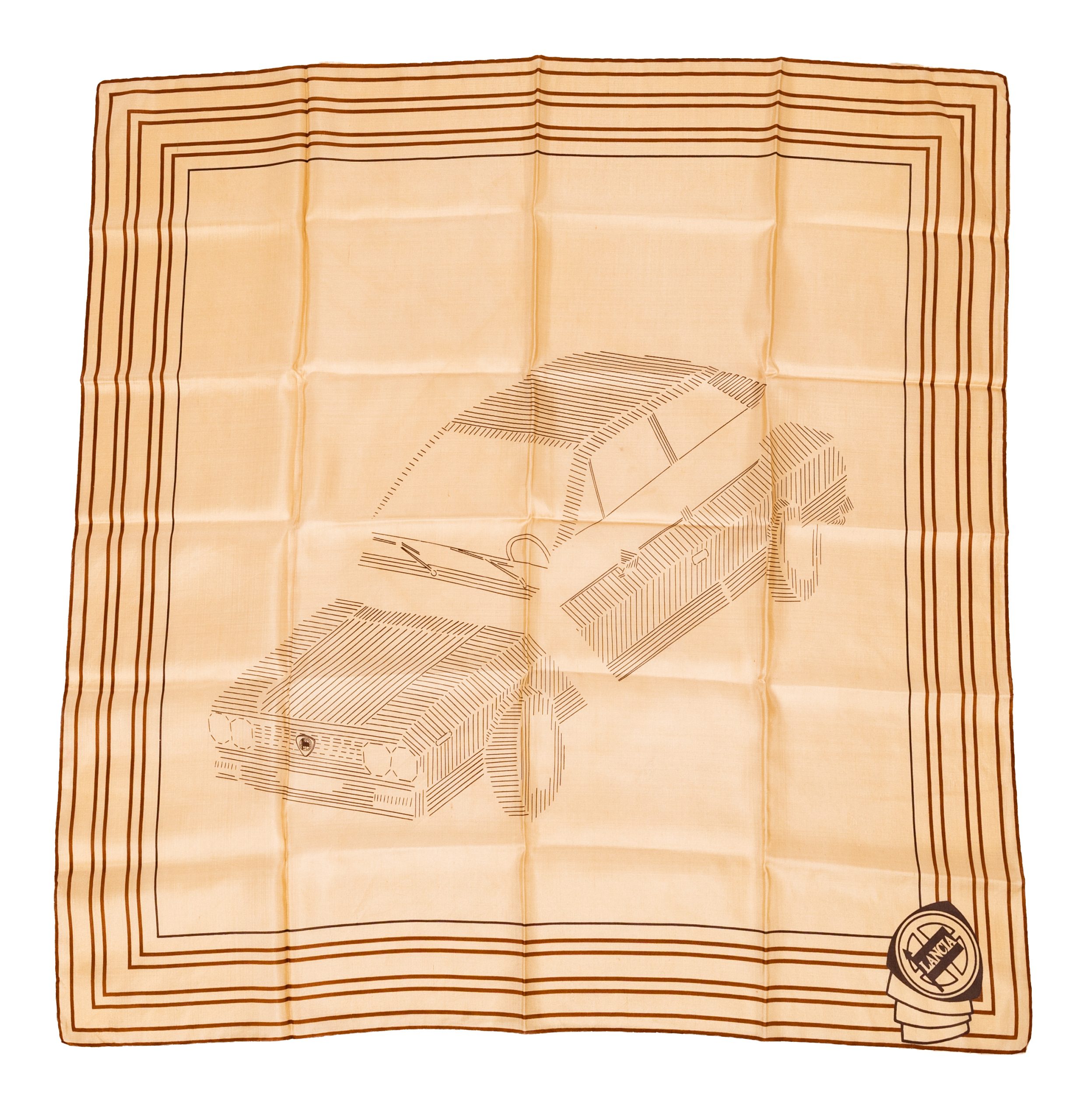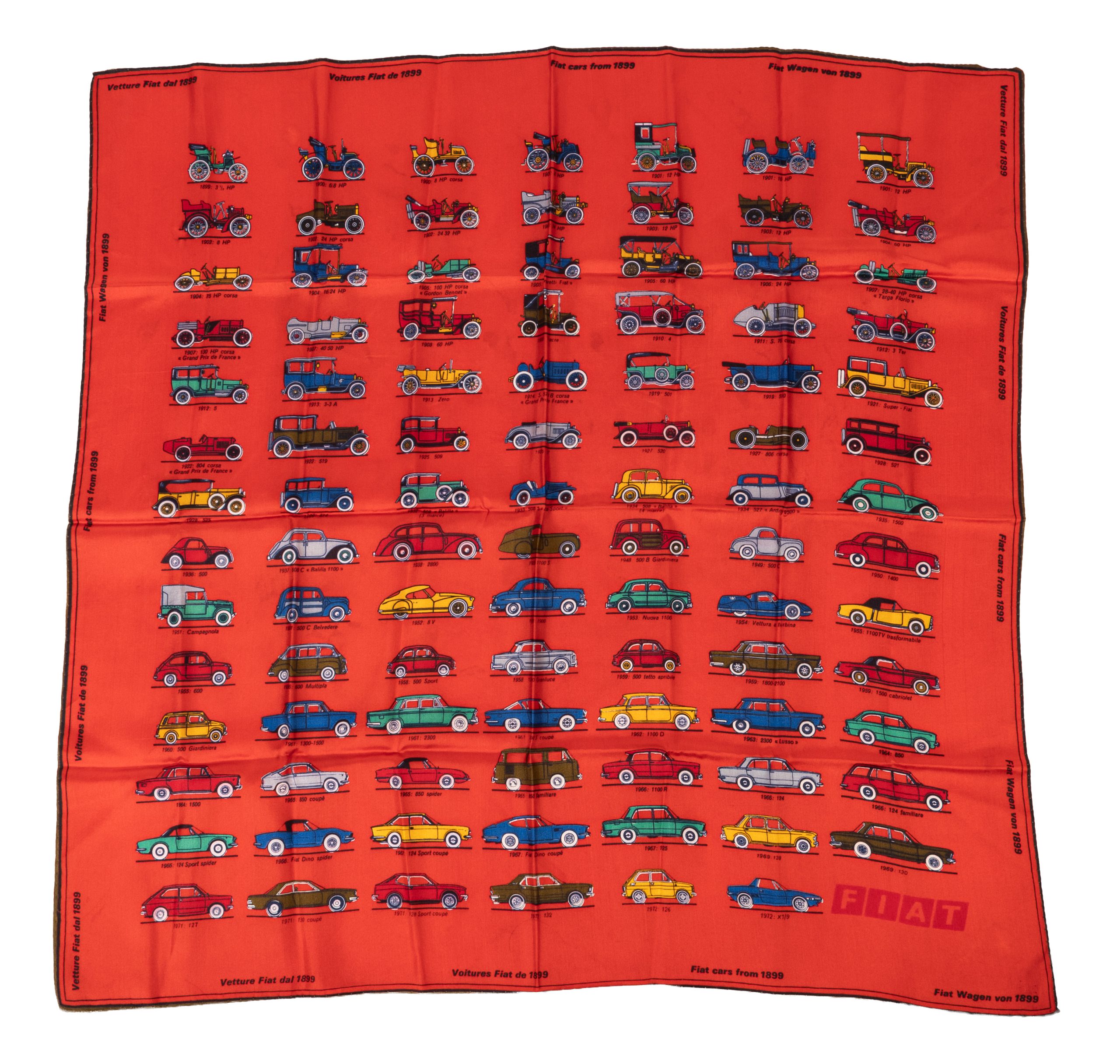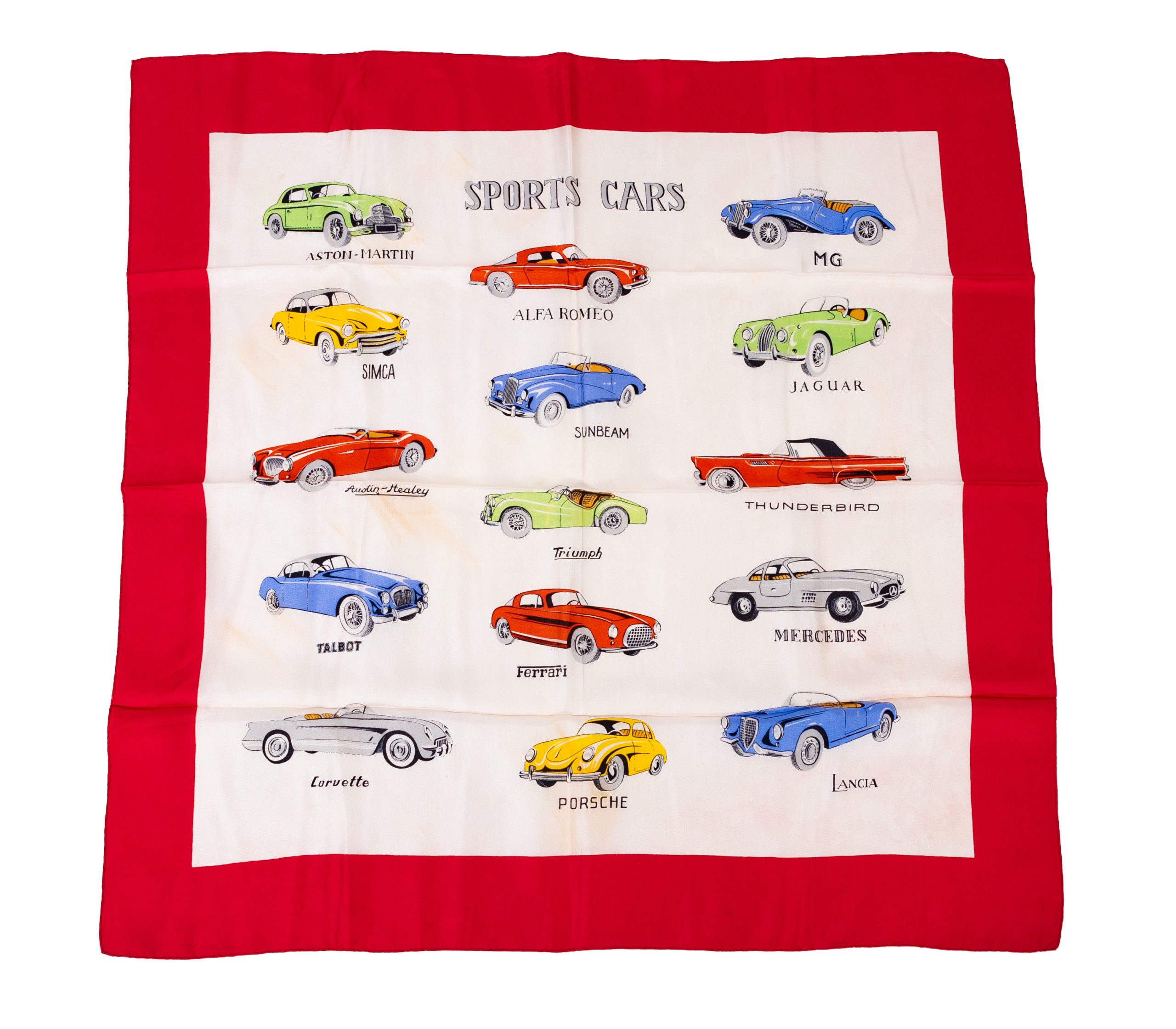 Lote compuesto por cuatro pañuelos, tres de temática automovilística y uno de aviación en seda de tonalidades rojas, blancas y marrones. En buen estado.