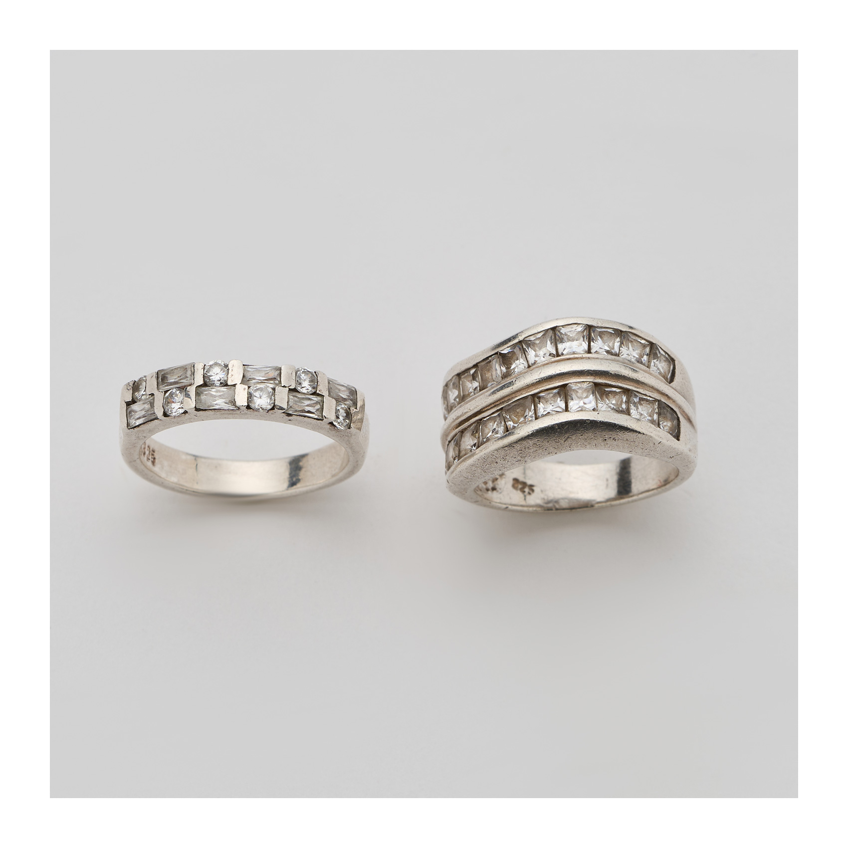 Dos sortijas en plata, una con dos bandas de circonitas talla carré y otra con circonitas tallas redonda y baguette.