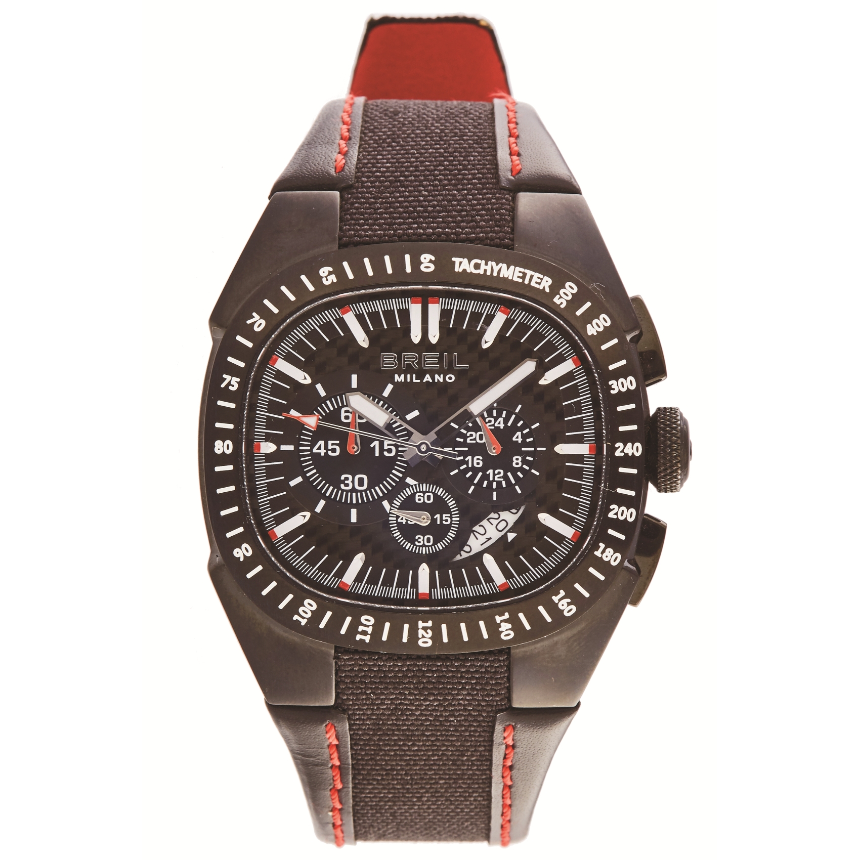 BREIL. Reloj de pulsera para caballero. En acero pavonado y correa de piel. Esfera negra con numeración a trazos aplicados y tres esferas complementarias. Calendario fecha entre 4 y 5. Cronómetro. Mecanismo de quartz.