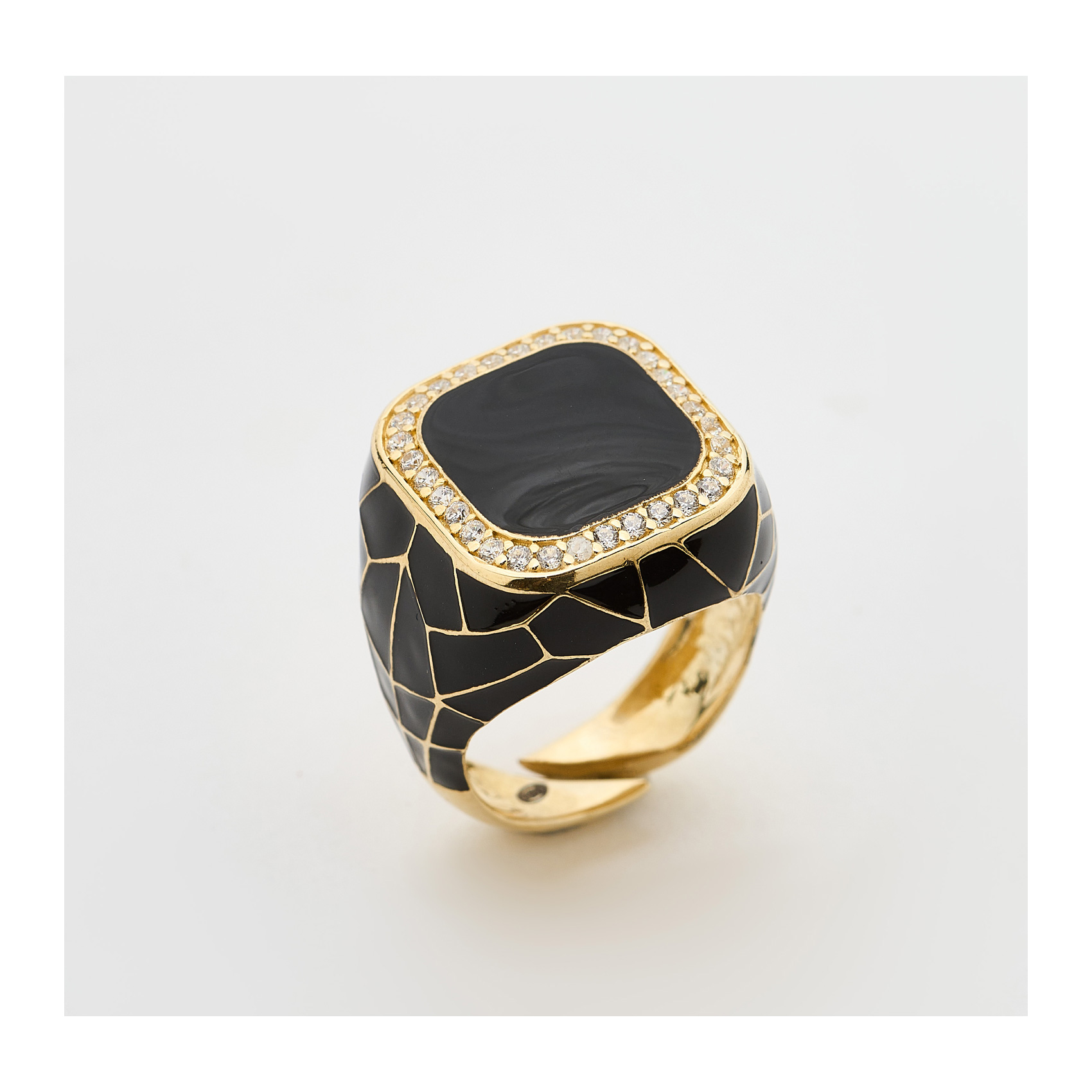 Sortija diseño sello en plata dorada y esmalte negro con circonitas.