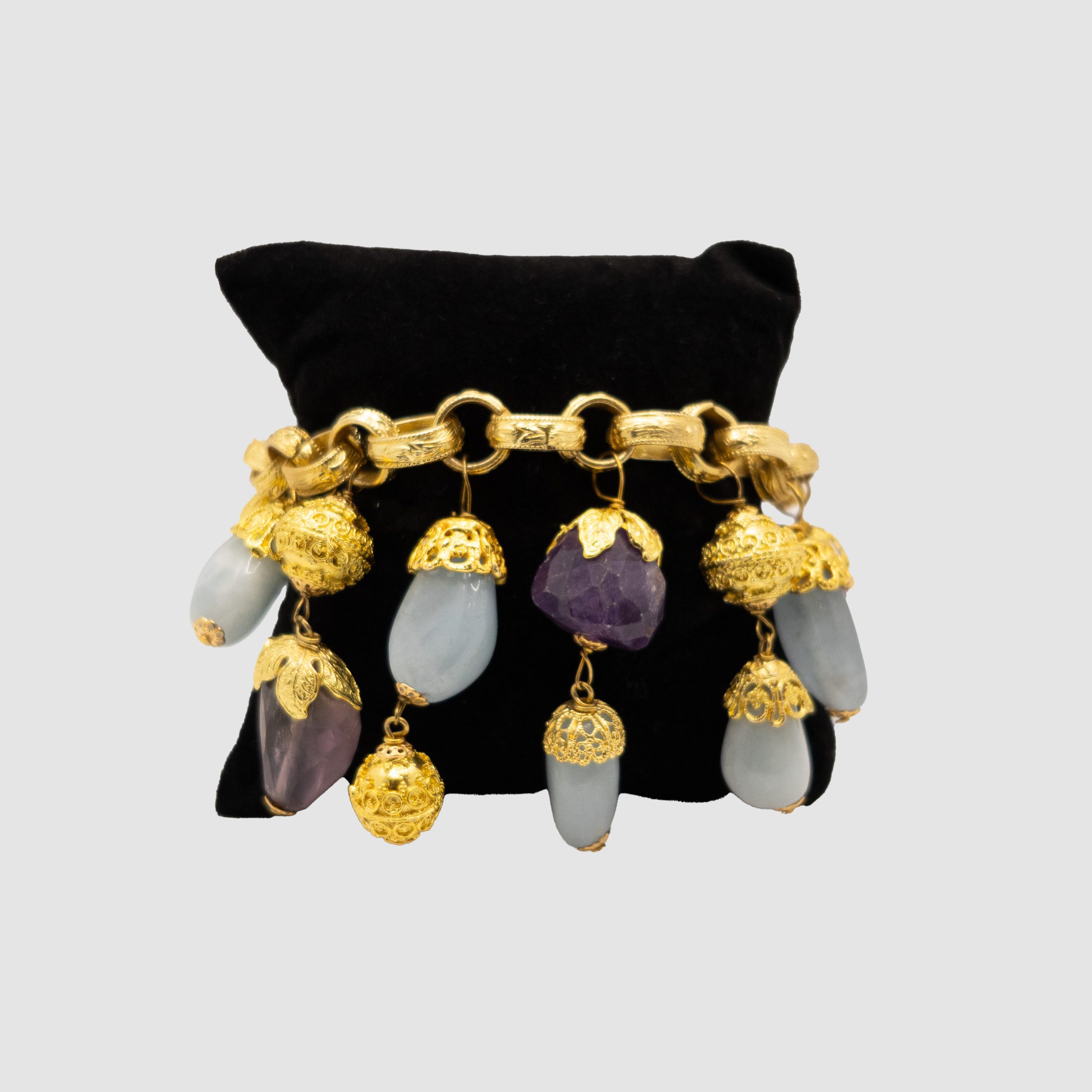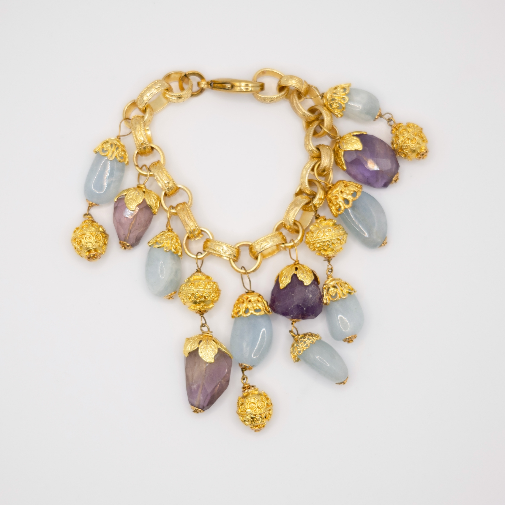 Pulsera de eslabones belcher en plata dorada de los que cuelgan cuentas de amatista y calcedonia en diversas tallas y medidas y motivos circulares texturizados.