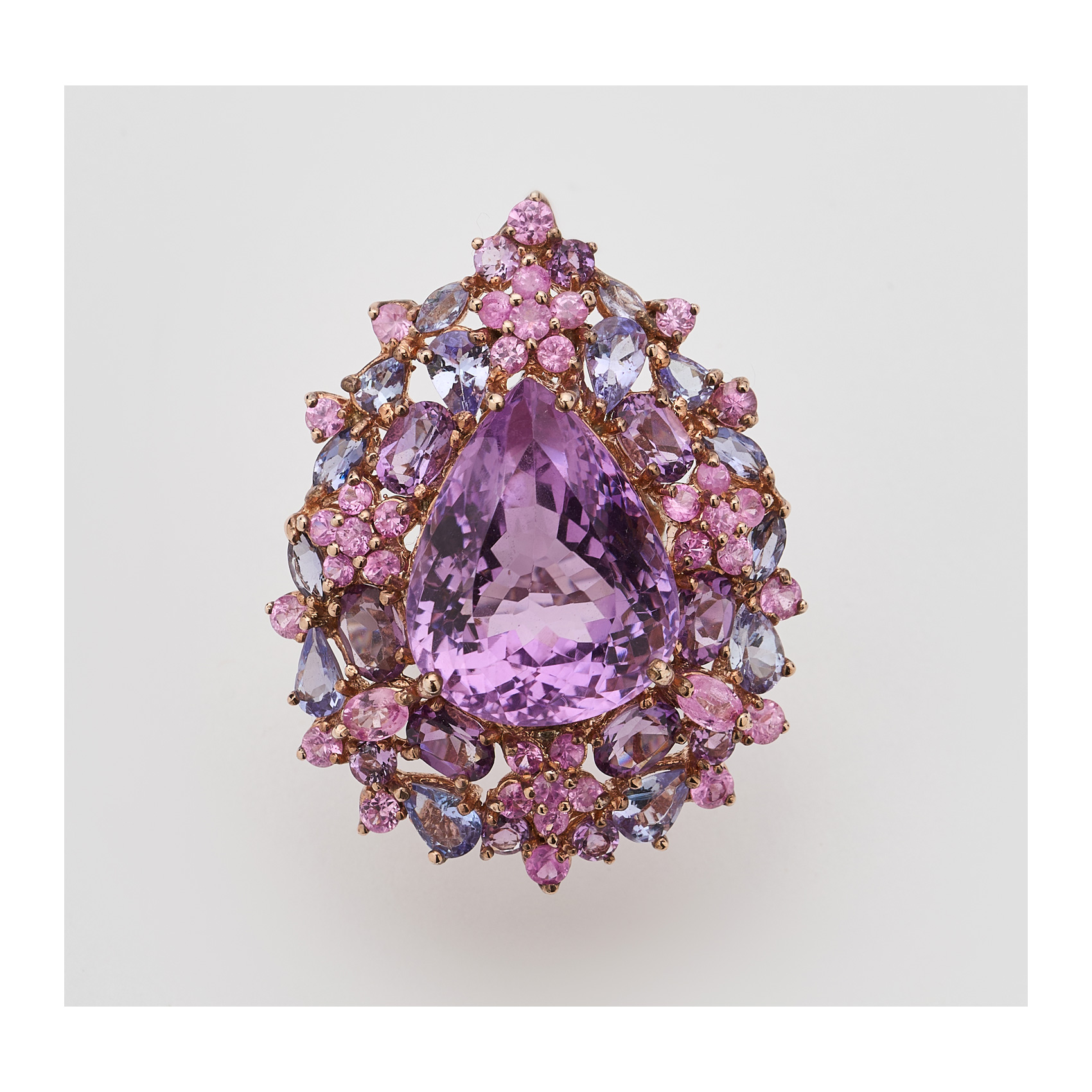 Sortija en plata rodiada y plata rosa con amatista talla perilla de 21 x 16 mm. orlada por rosetones de zafiros rosas, tanzanitas y símiles de agua marina en varias tallas y medidas.