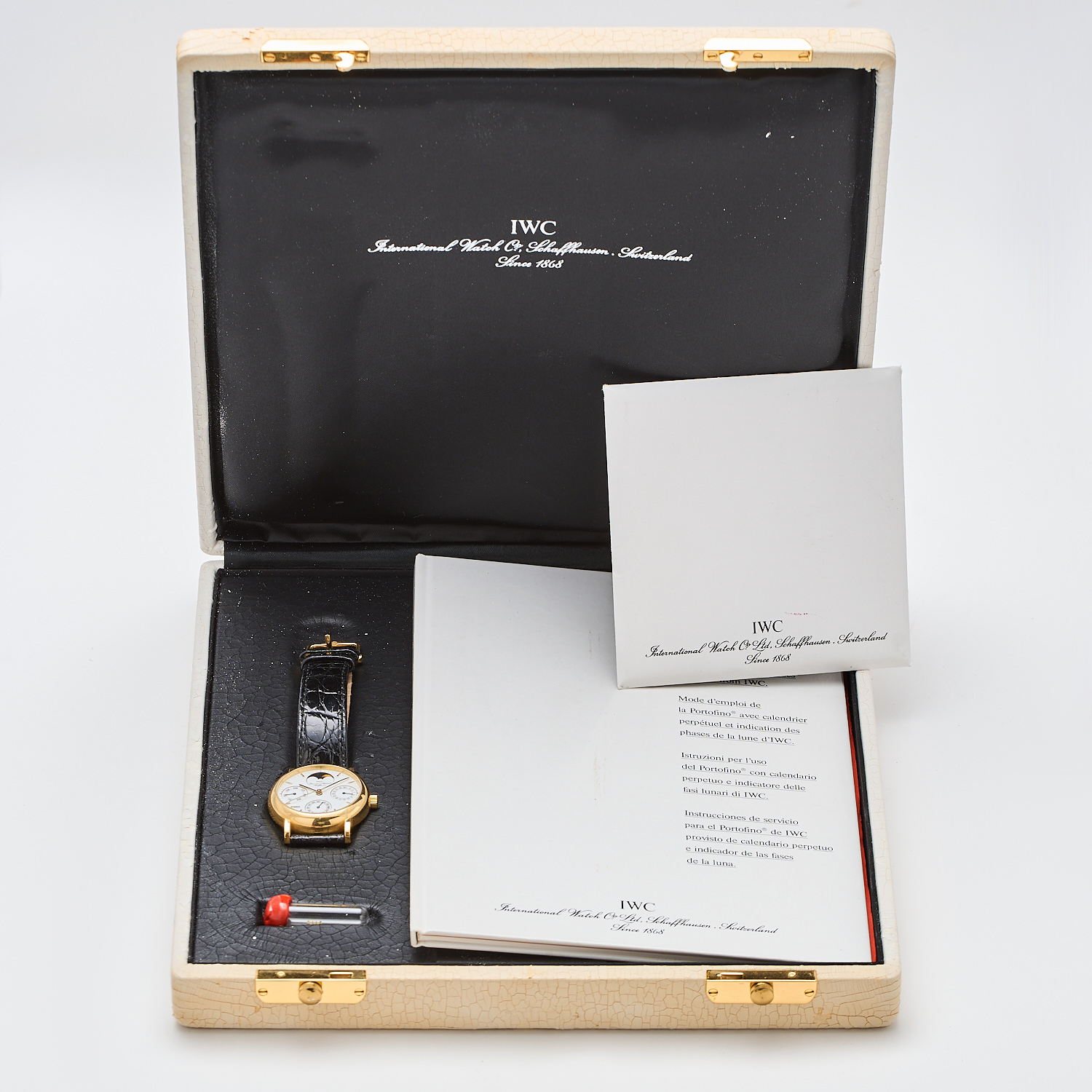 IWC «Portofino». Reloj de pulsera para caballero, c.2000. En oro y correa de piel con hebilla ardillón. Ref.3541-012/2477715. Esfera blanca con numeración a trazos aplicados. Calendario día entre 7 y 8. Tres esferas complementarias para día de la semana y mes. Calendario perpetuo. Cristal zafiro. Mecanismo automático.