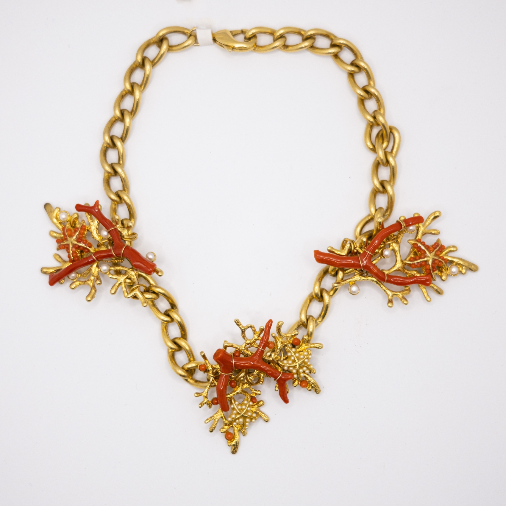 Collar de eslabones barbados en plata dorada con tres centros de inspiración marina, decorados con estrellas de mar y ramas de coral rojo. Estimación:750 – 850€
