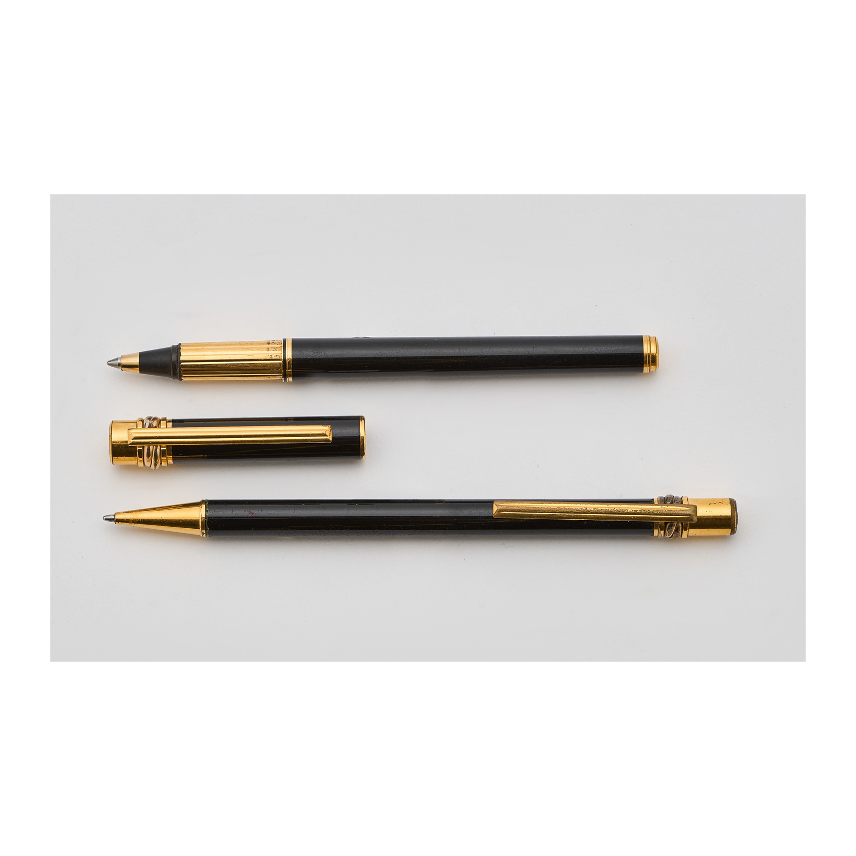CARTIER «Le must». Juego de bolígrafo y roler en laca negra con detalles en plaqué oro.