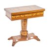 Mesa de juego holandesa en madera de palosanto, s.XX. Tapa abatible y decoración en marqueterías de motivos florales en limoncillo y paisajes. Con damero al interior.