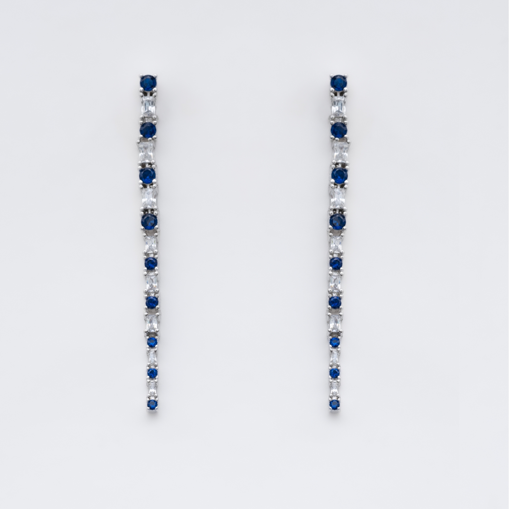 Pendientes largos en plata rodiada con símiles de zafiro azul talla redonda y circonitas talla baguette engastados en garras, 5 cm. Estimación:150 – 190€