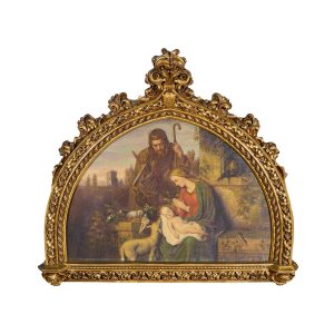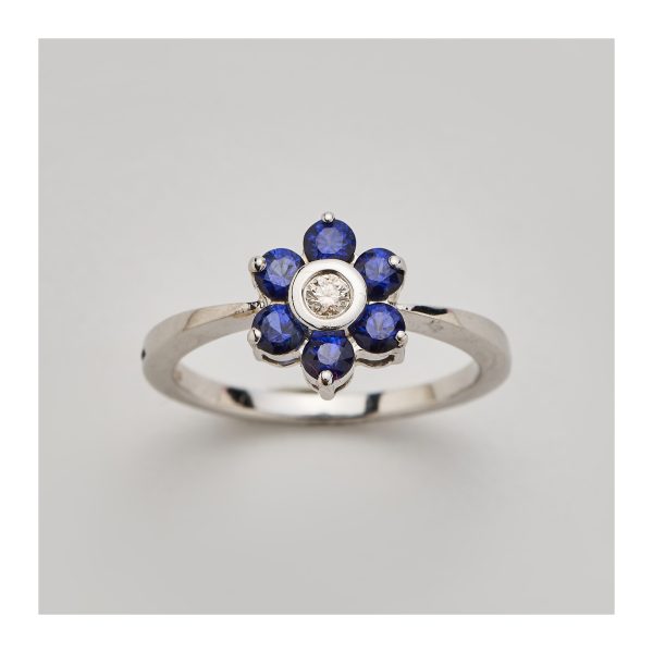 Sortija rosetón en oro blanco con centro de diamante talla brillante engastado en chatón y orla de zafiros azules talla redonda engastados en garras.