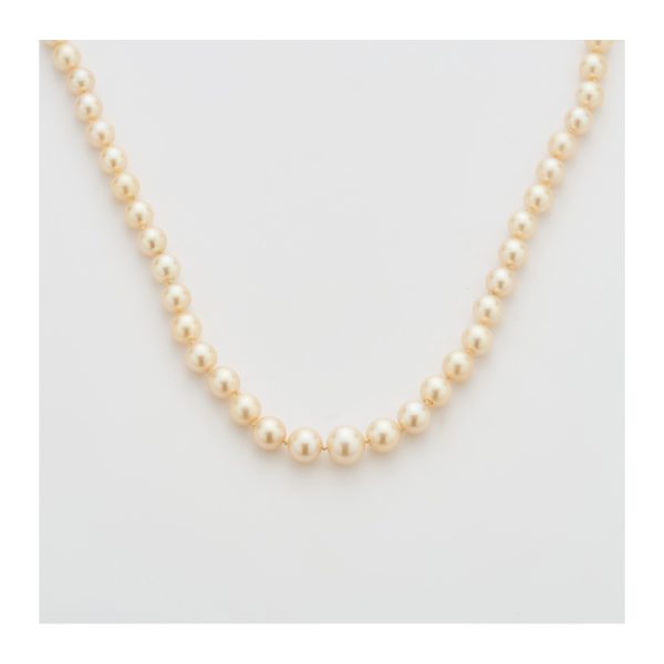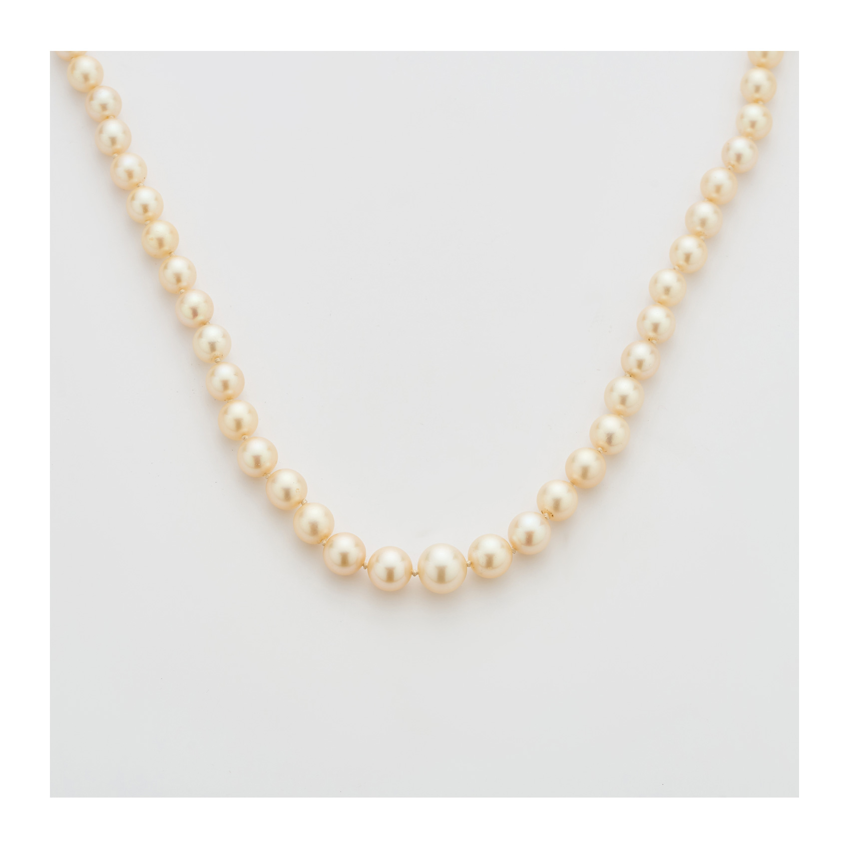Collar de perlas cultivadas en degradé 9-6,5 mm. con cierre en oro y cabujón oval de cuarzo rosa de 12 x 9 mm.