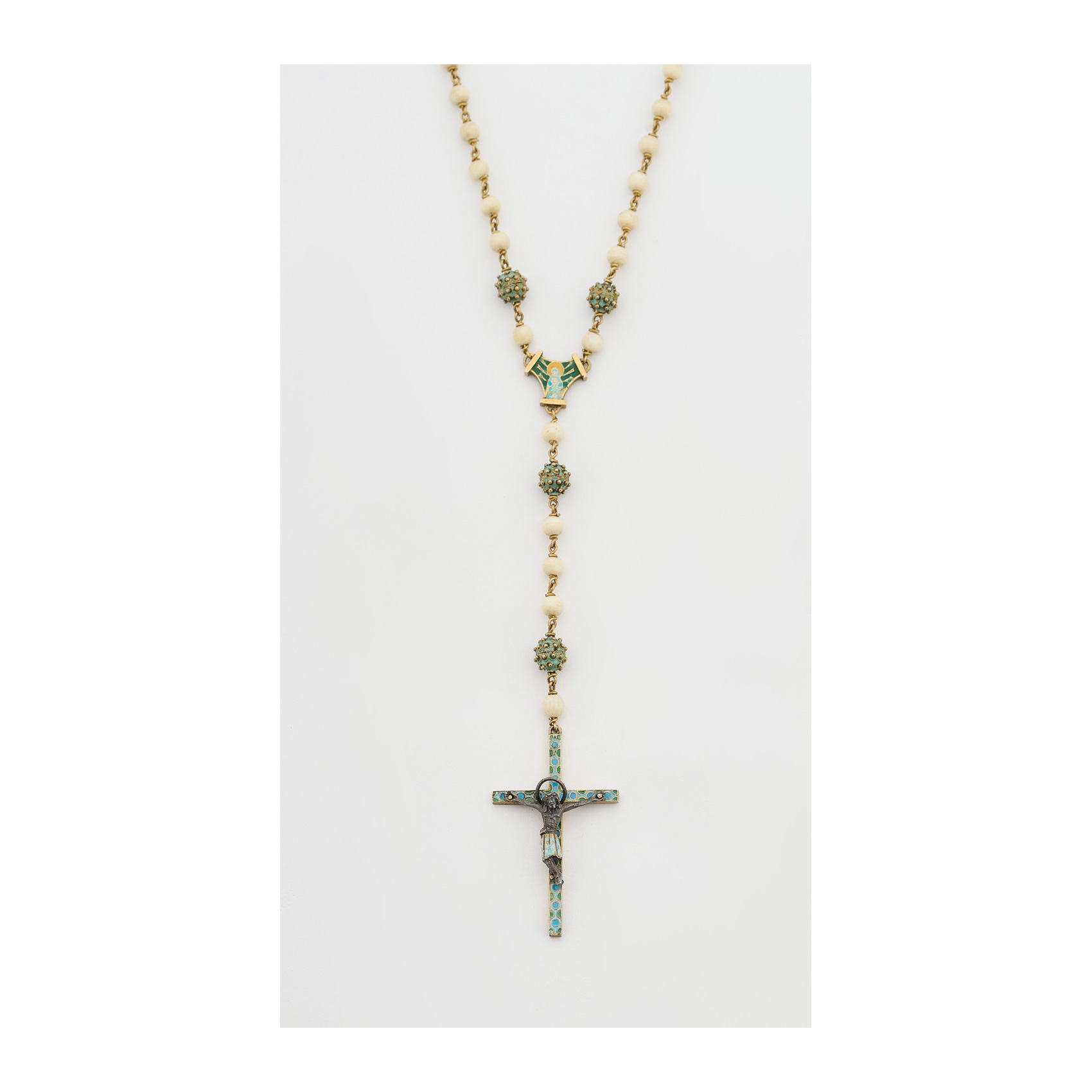 Rosario en plata dorada con cuentas en marfilina de 4,5 mm. y cruz, charm y separadores en esmalte.