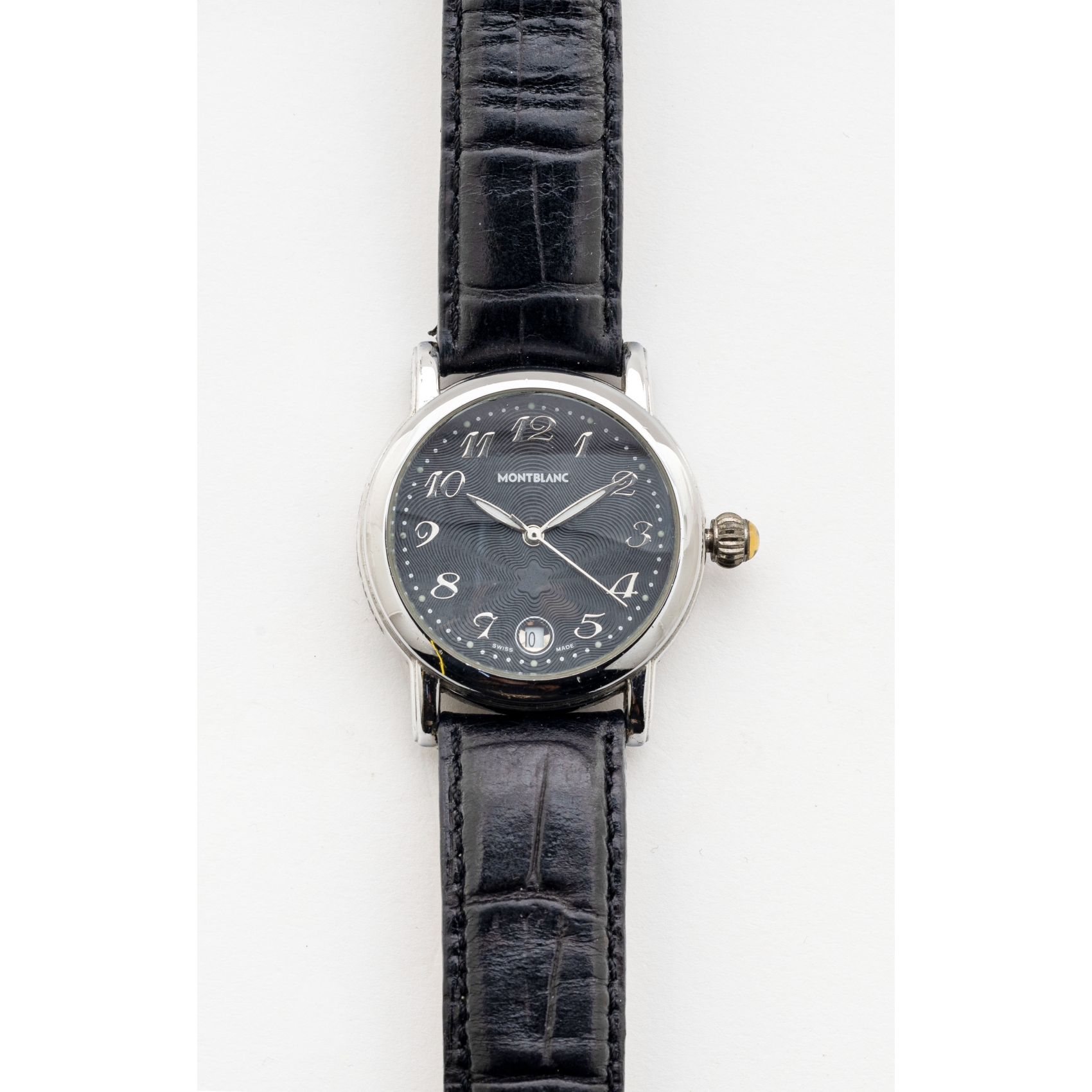 MONTBLAC. Reloj de pulsera unisex en acero y correa de piel. Esfera negra con numeración arábiga. Calendario fecha a las 6. Maquinaria vista. Mecanismo automático.