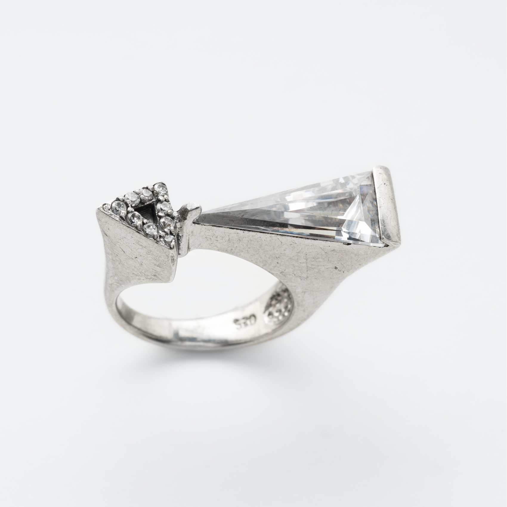 Sortija en plata con circonita talla triangular de 18 x 9 mm y triángulo de circonitas engastadas en garras.
