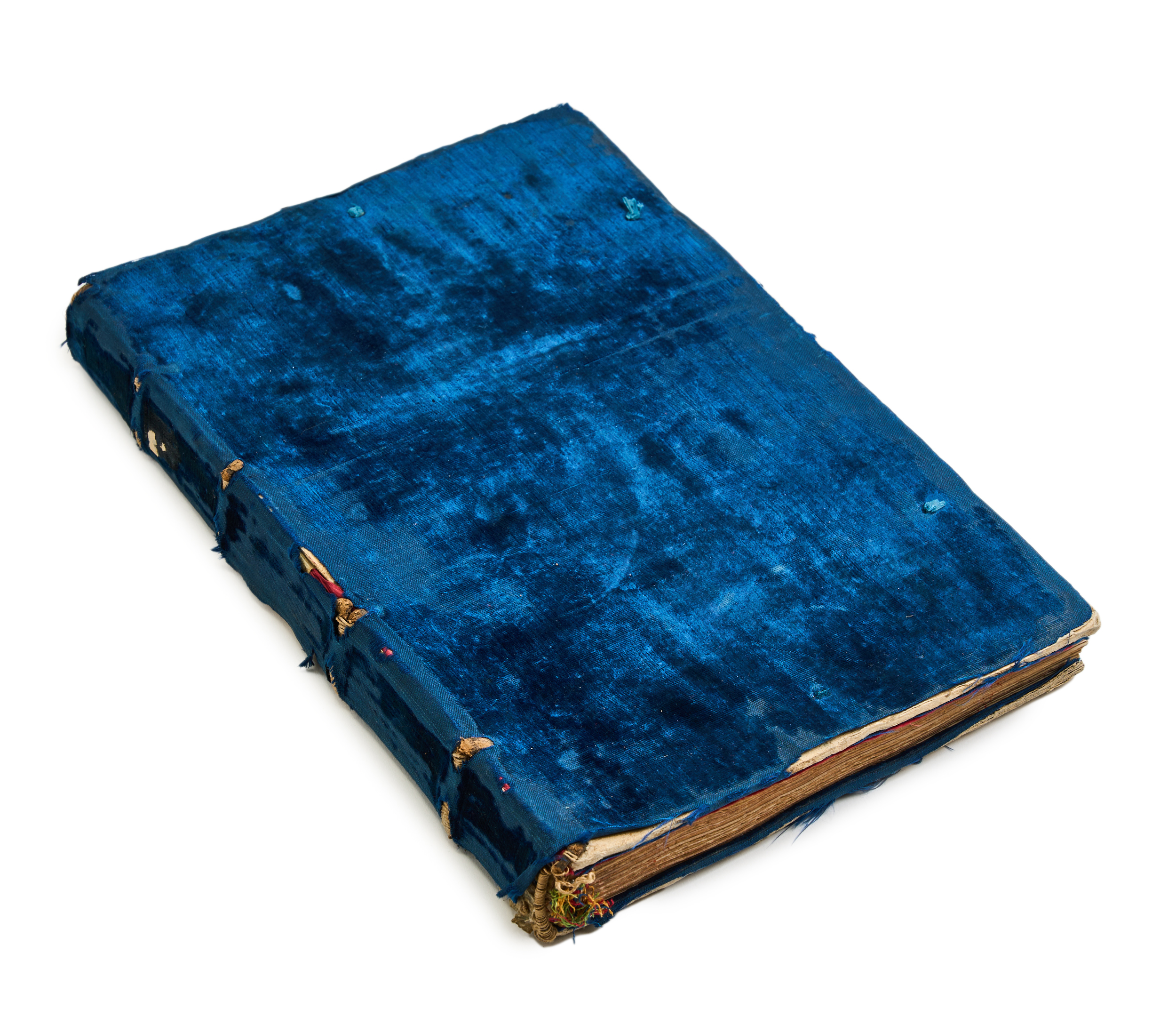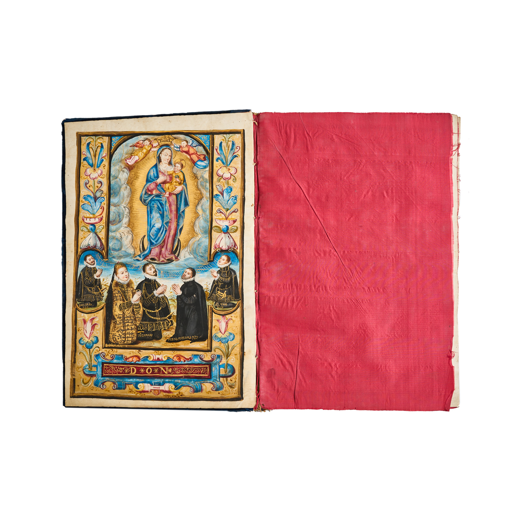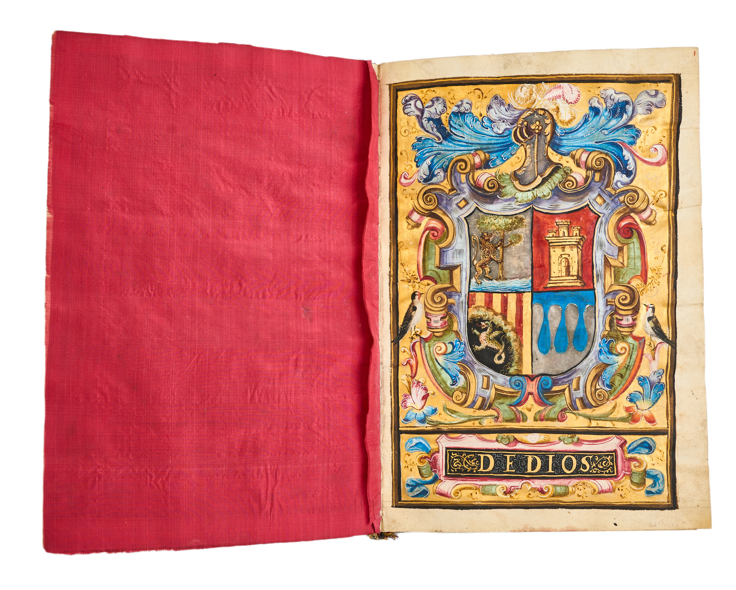 Carta ejecutoria rubricada en letra renacentista sobre pergamino. Iluminado con témperas y pan de oro pintadas a mano con representaciones de la Virgen y el Niño, Jesús, un caballero batallando y escudos heráldicos. Encuadernado en terciopelo azul.