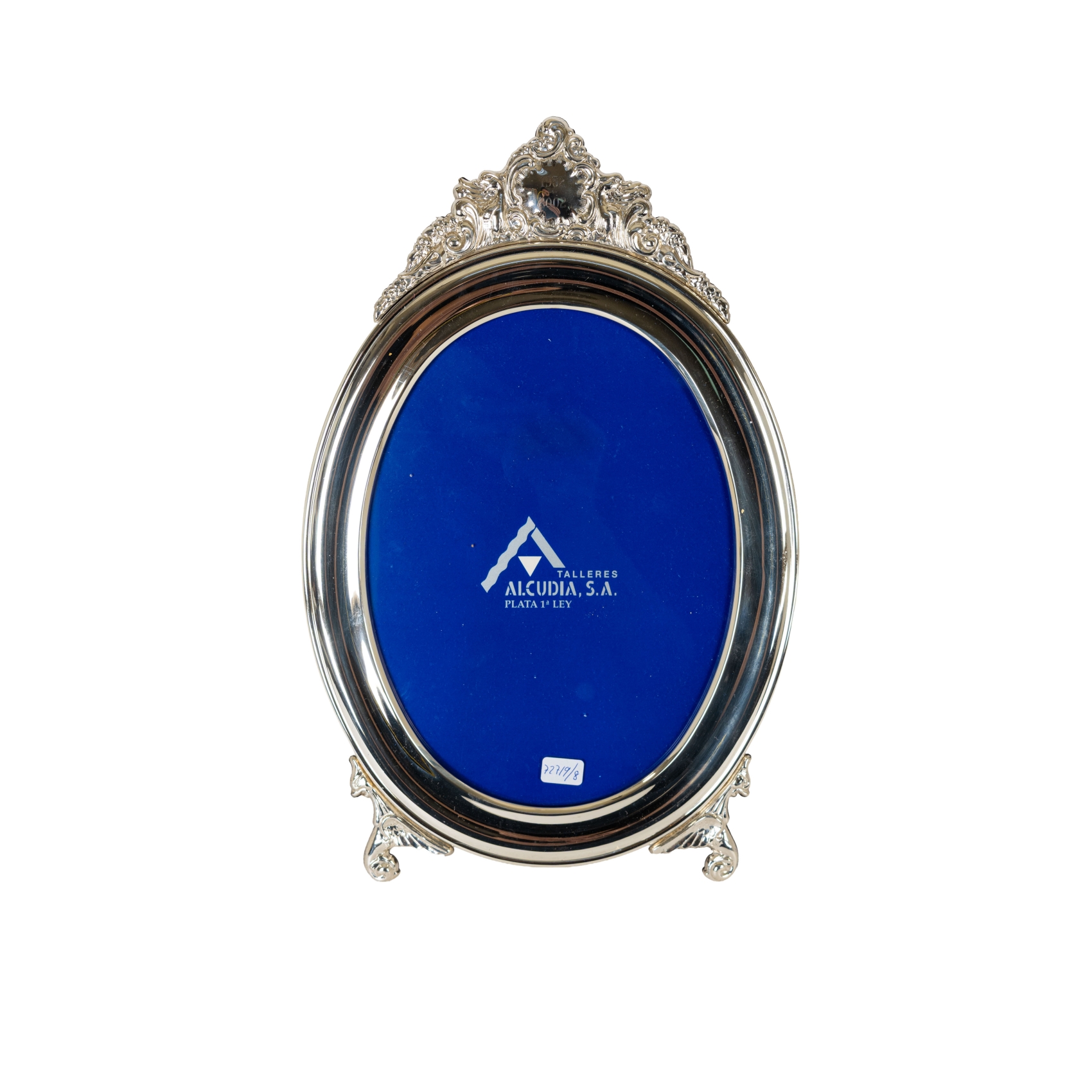 Marco ovalado de sobremesa en plata española punzonada con pequeño copete, s.XX. Presenta fechas grabadas.