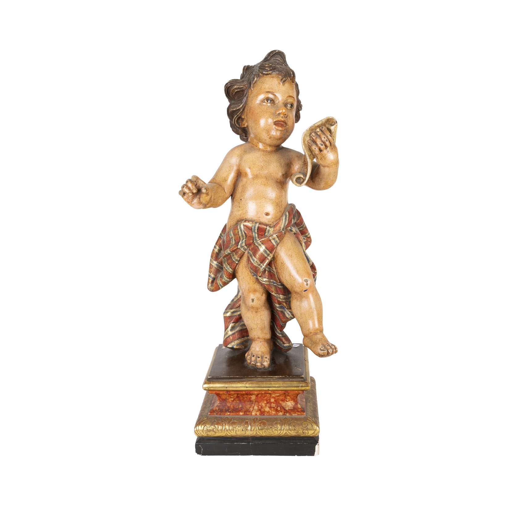 Escultura en madera tallada, policromada y parcialmente dorada. Apoya sobre peana en madera marmoleada.
