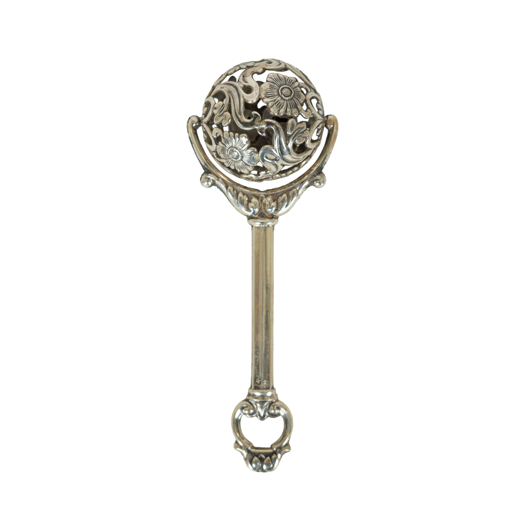 Sonajero en plata española punzonada con contraste del platero Pedro Durán, s.XX. Decoración calada de motivos florales. Adjunta estuche.