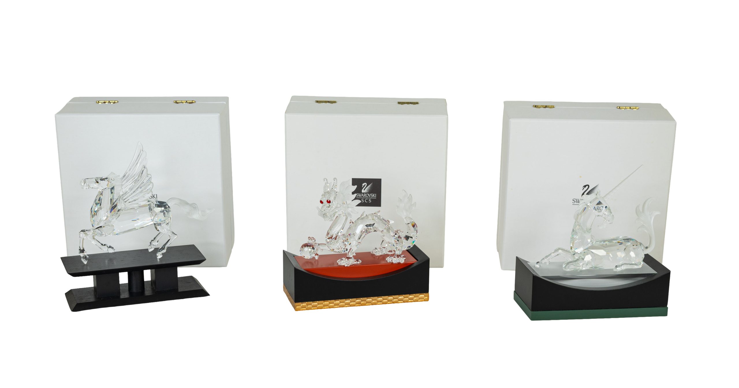 Unicornio, Pegaso, Dragón. Colección «Fabulous Creatures». Juego de tres figuras en cristal austríaco translúcido, 1996. Firmadas al ácido en la base. Adjuntan estuches originales y peanas con sus cajas.