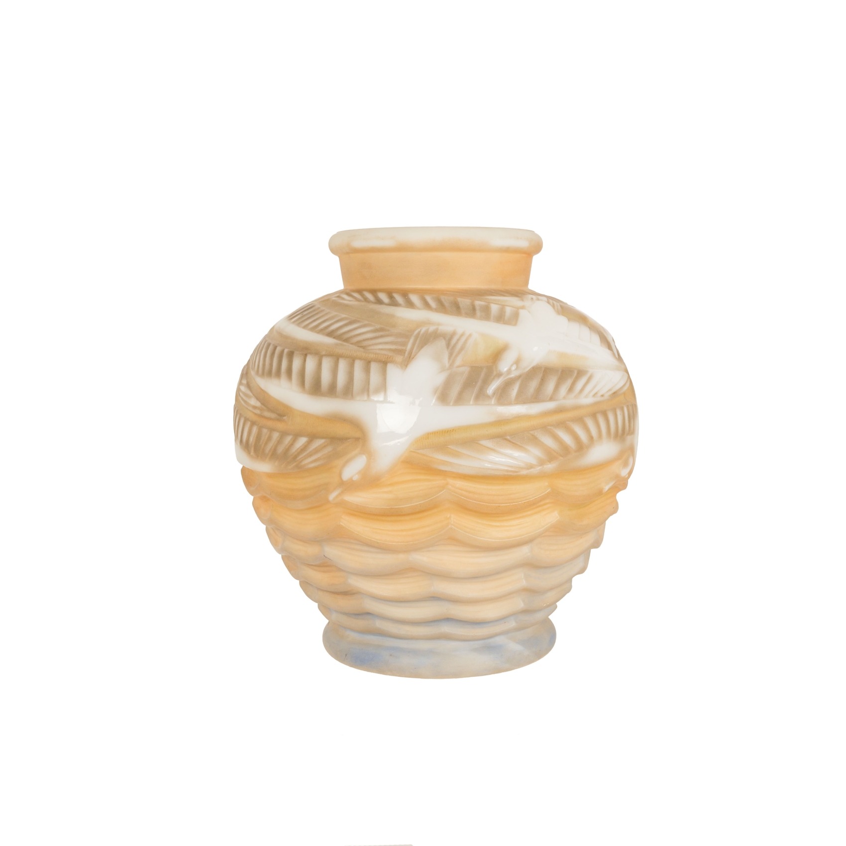 Jarrón en cristal de opalina de tonalidad blanca con decoraciones talladas con motivos de gaviotas sobre el mar, c.1950. Firmado en rojo en la base.