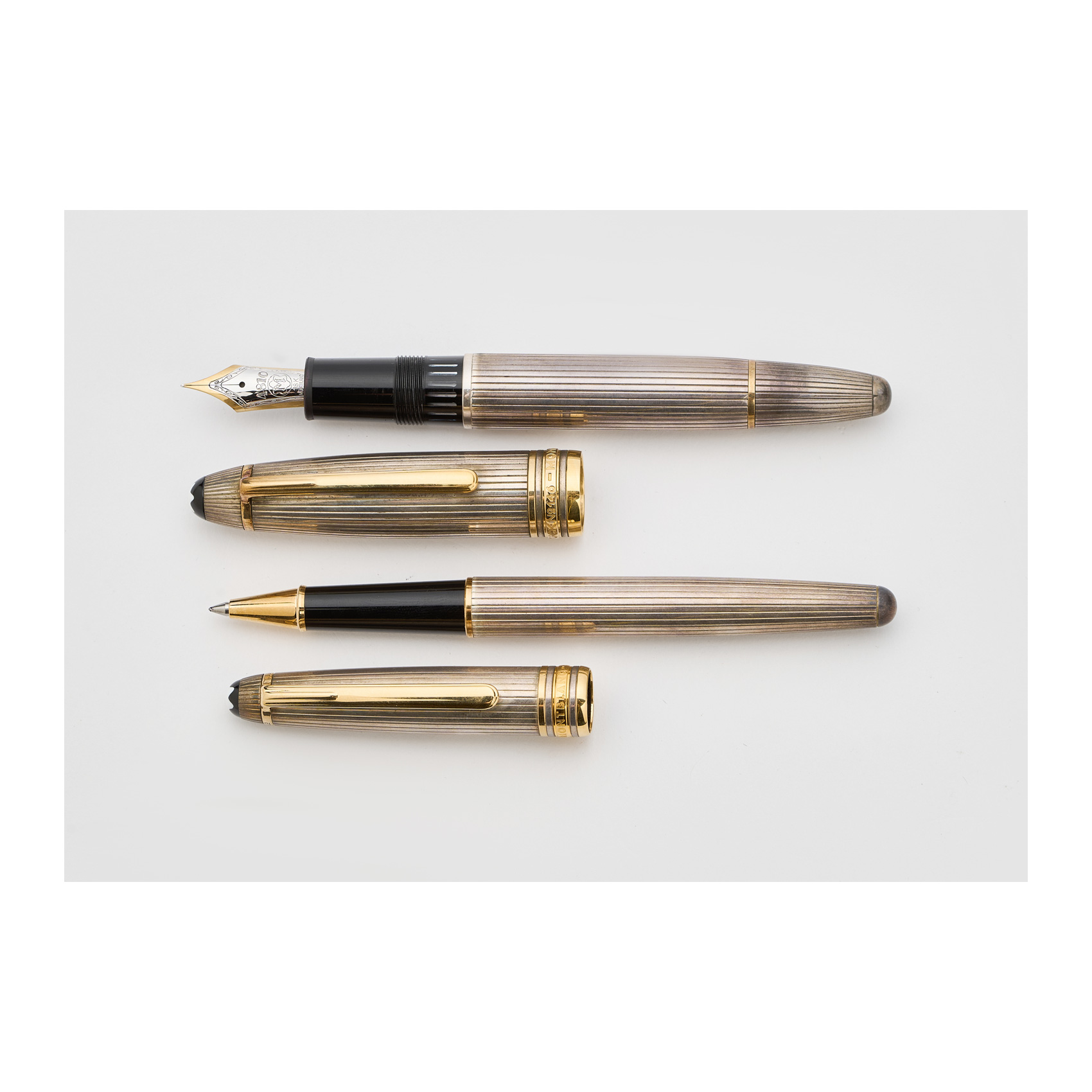 MONTBLANC. Estilográfica «Meisterstück Solitaire 146 » y roler «Meisterstück Solitaire 144». En plata con decoración estriada y detalles en plaqué oro. Plumín M en oro 18K, sistema de carga por cartucho.