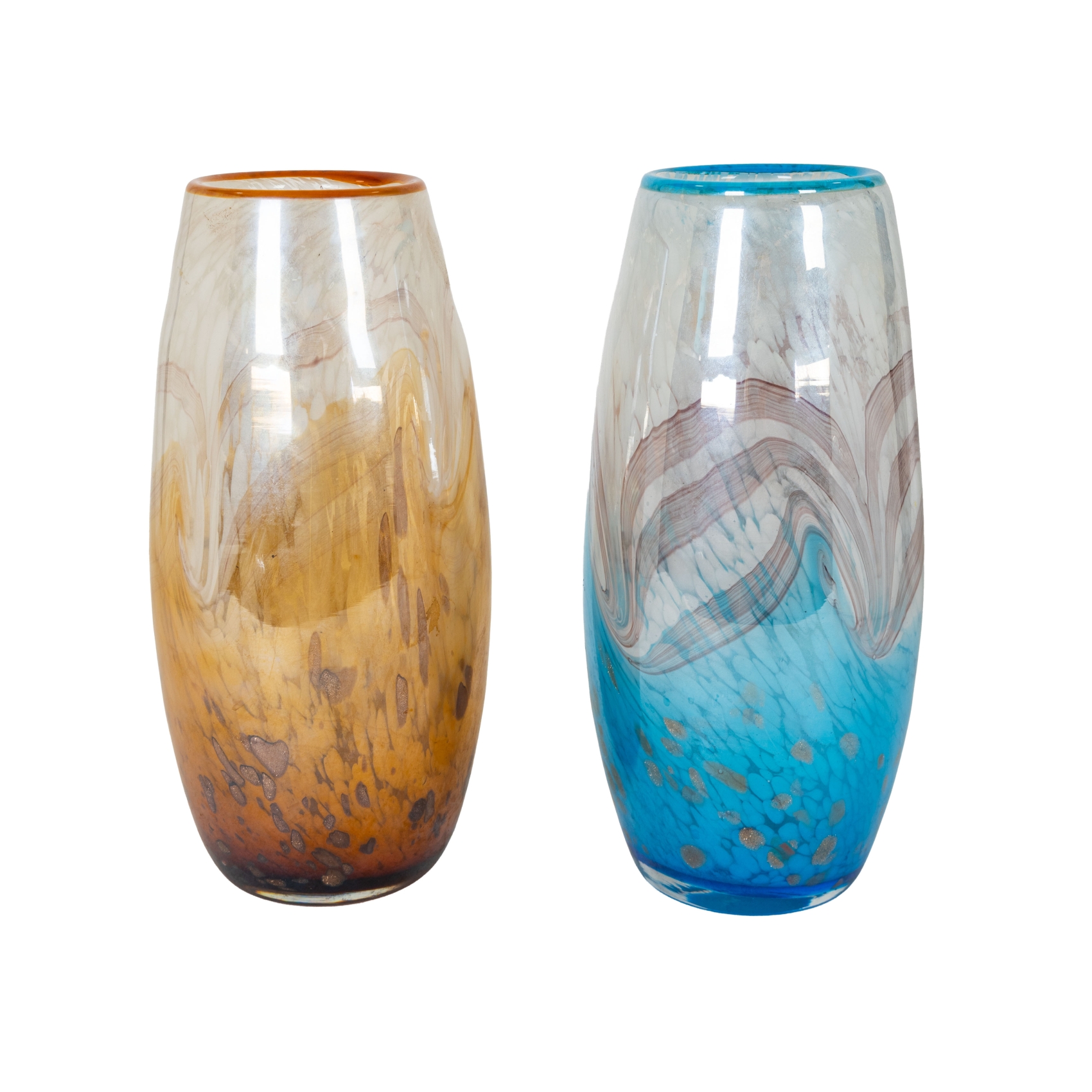 Pareja jarrones en cristal de Murano irisado y moteado con inclusiones en aventurina de tonalidades naranja y azul, s.XX.