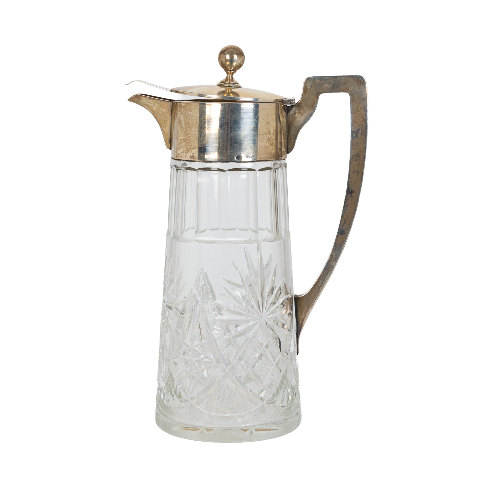 Jarra en cristal tallado con decoración facetada y de motivos en tipo punta de diamante con boca en plata catalana punzonada con contrastes de Barcelona, s.XX.