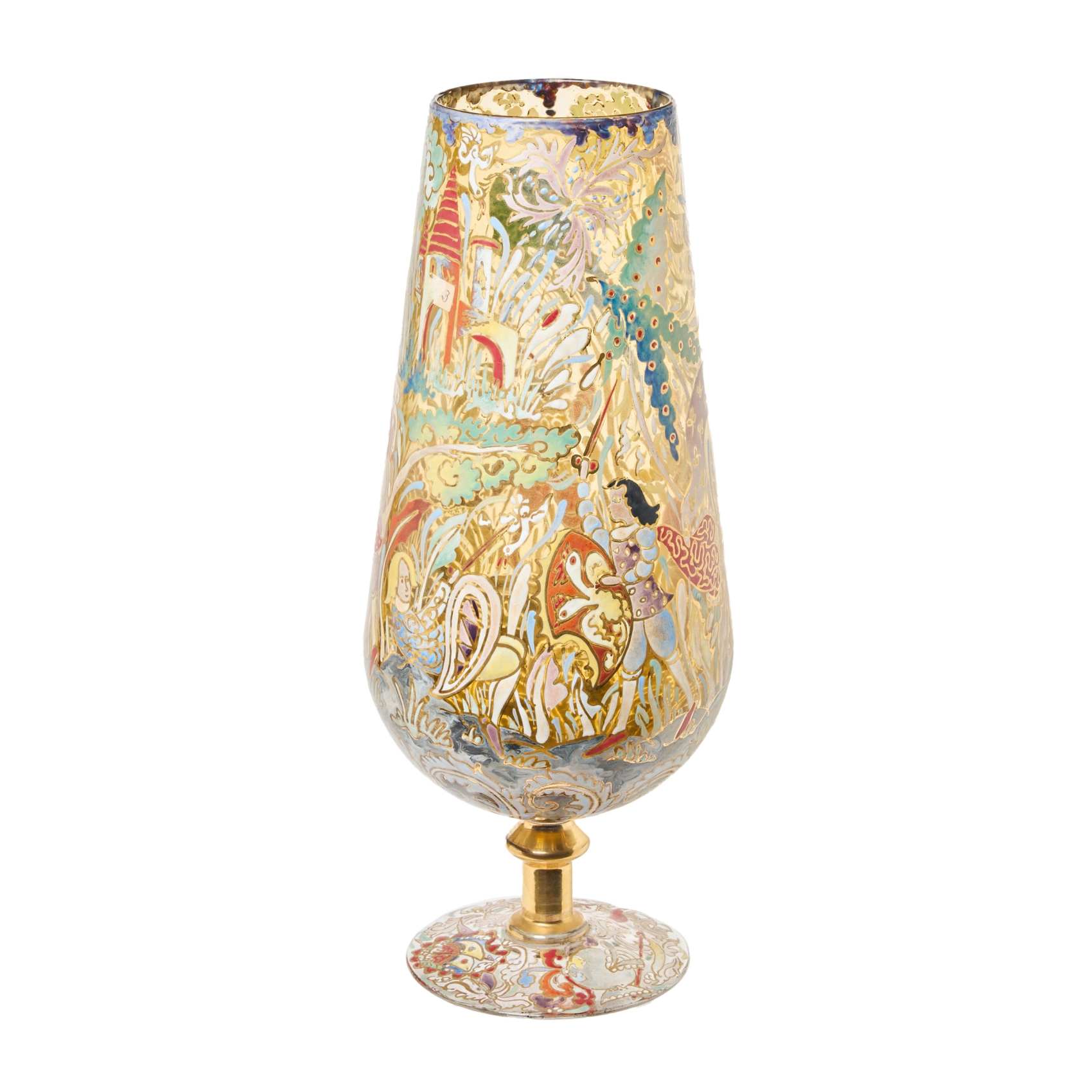 Jarrón en cristal de tonalidad ámbar con decoraciones esmaltadas al fuego de motivos caballerescos. Firmada.
