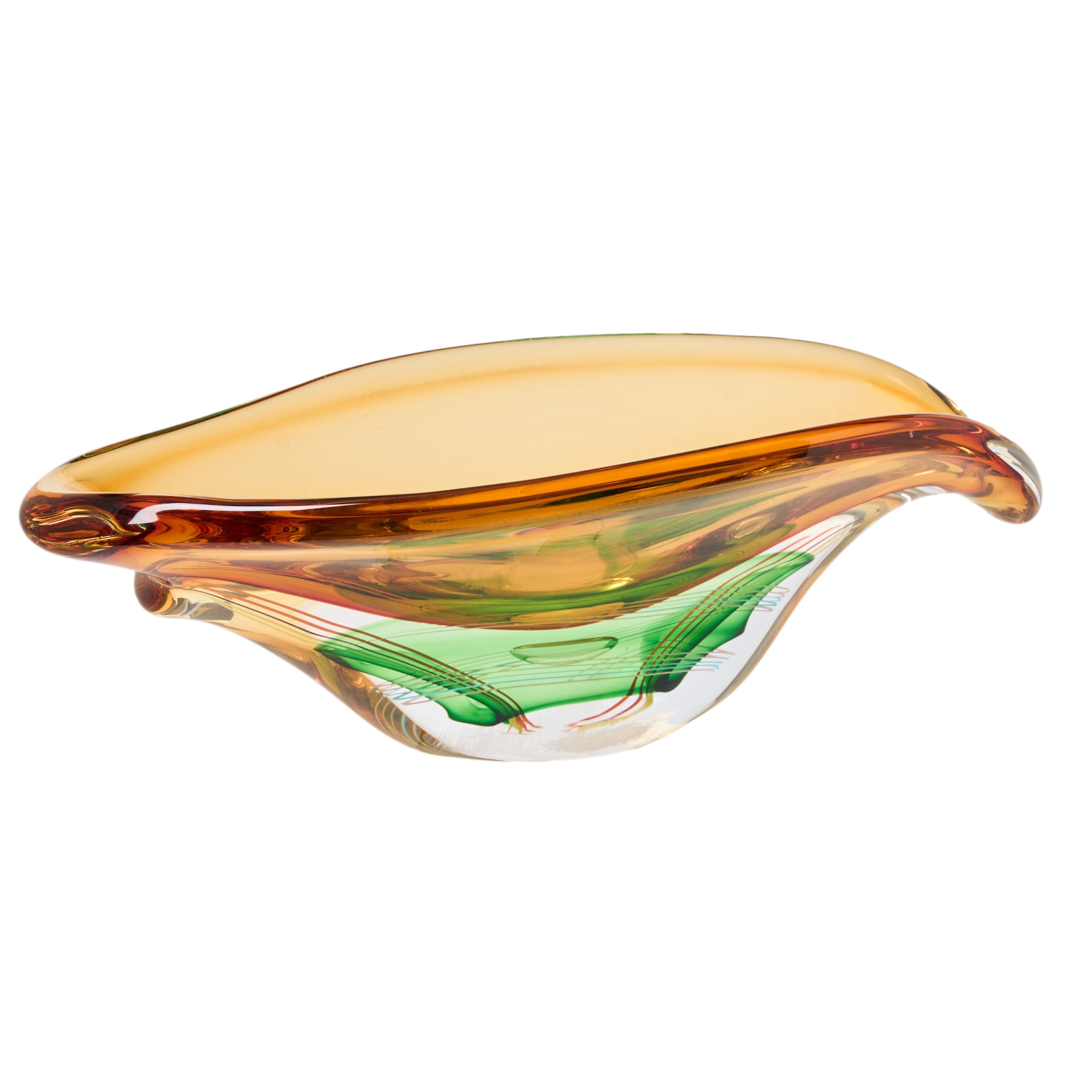 Centro de mesa en cristal de Murano «sommerso» en tonalidad ámbar y verde. Firmado en la base.