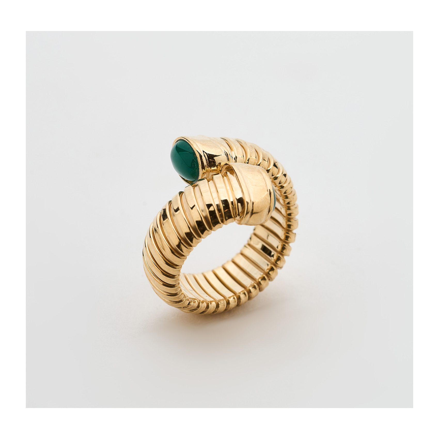 Sortija tubogas en plata dorada mate y brillo con centro abierto y rematado por cabujones ovales de símiles de esmeralda.