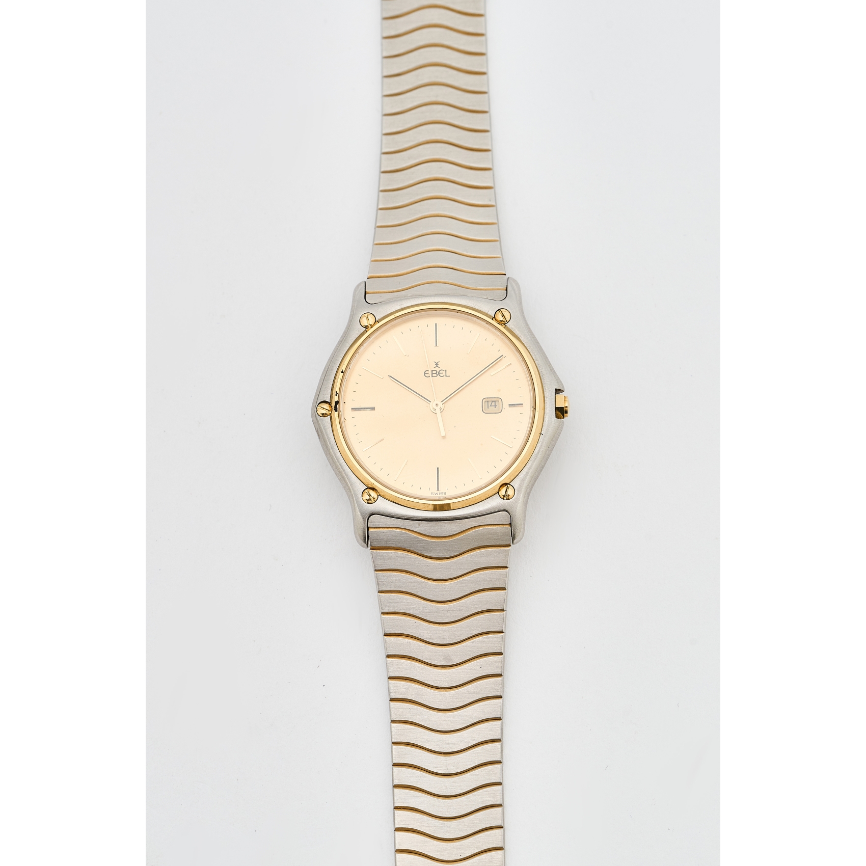 EBEL. Reloj de pulsera unisex. En acero y oro. Esfera dorada con numeración a trazos aplicados. Segundero a las 3. Mecanismo de quartz. A estrenar.