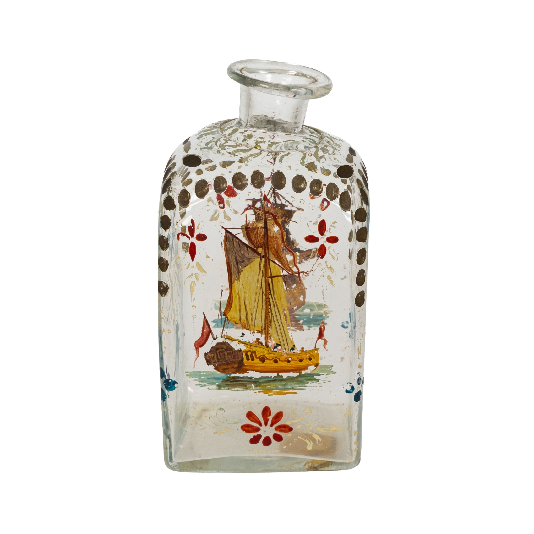 Botella en cristal soplado europeo esmaltado al fuego con decoración de motivos navales, s.XIX.